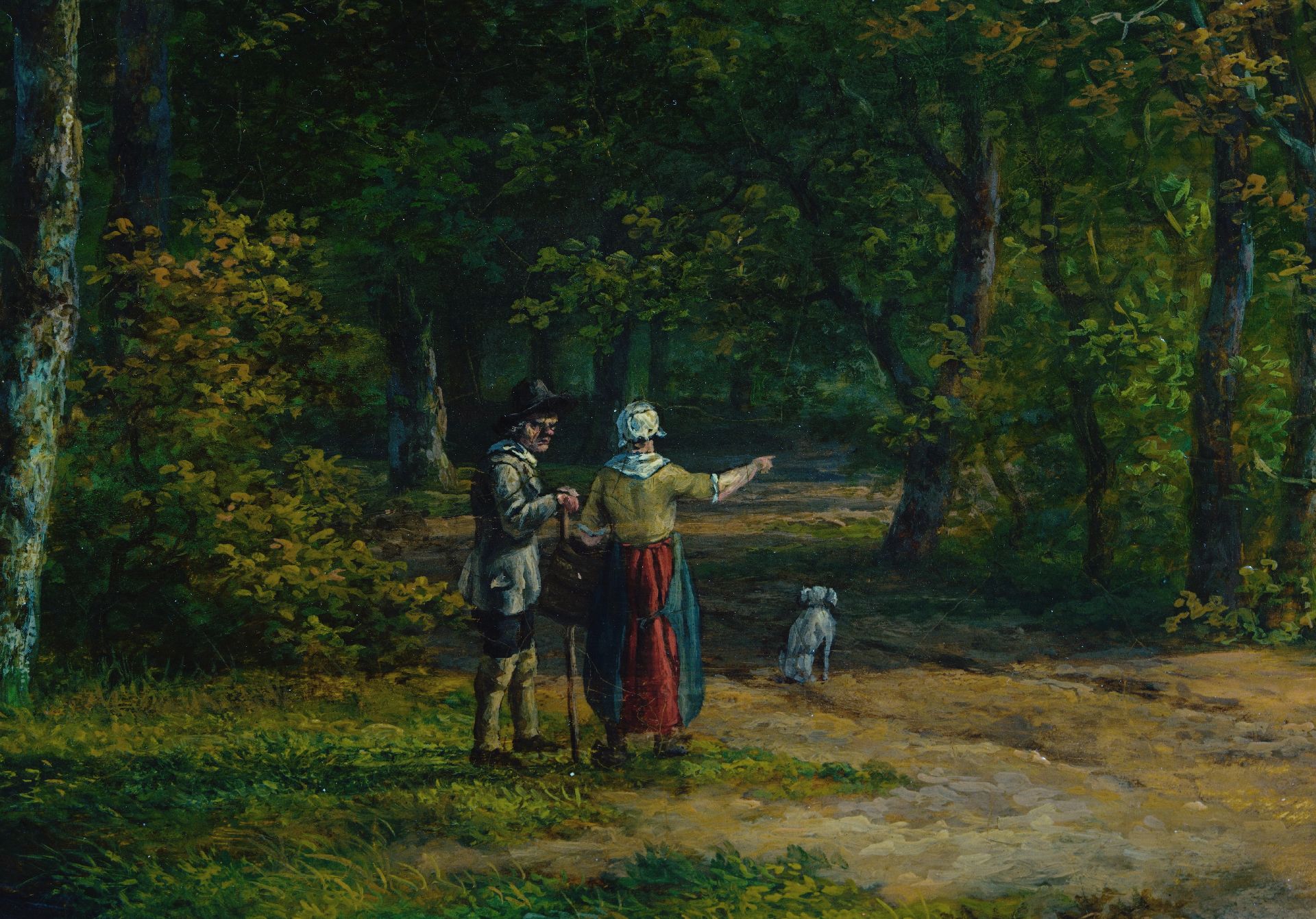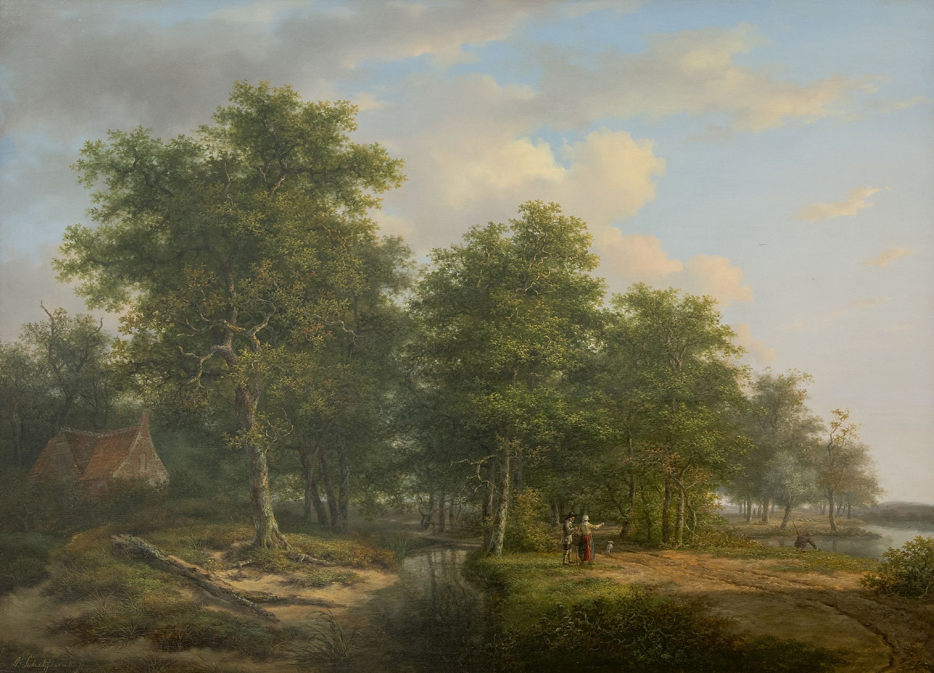 Andreas Schelfhout kunstwerk • schilderij • voorheen te koop Boslandschap met figuren bij een riviertje (pendant van winterlandschap)