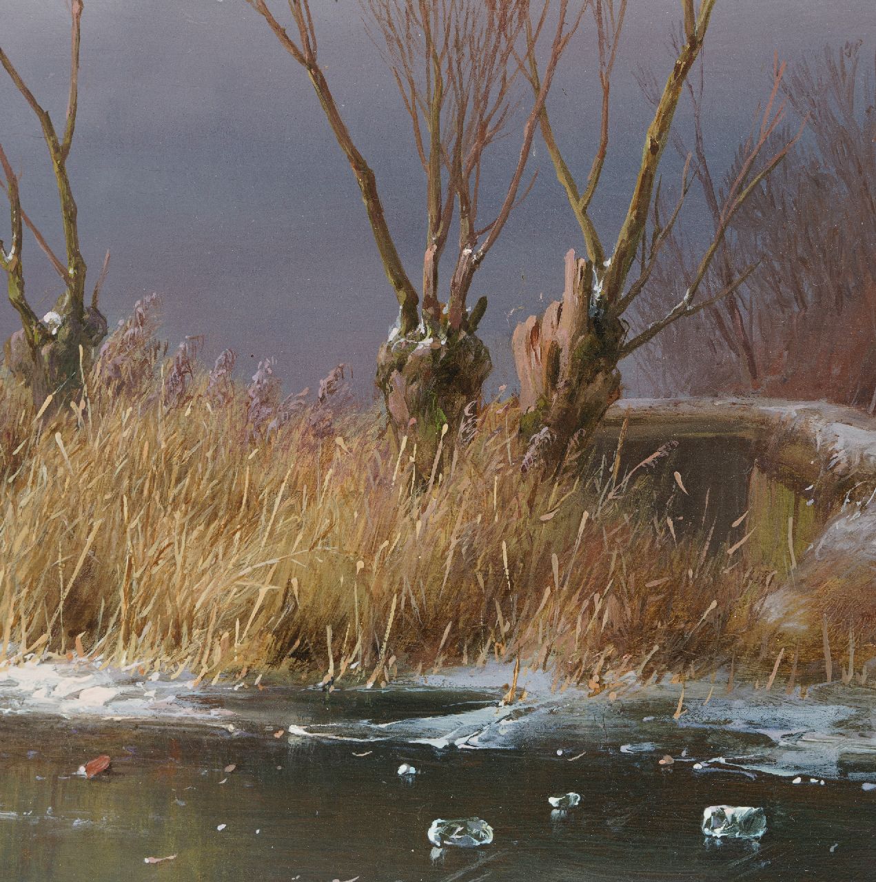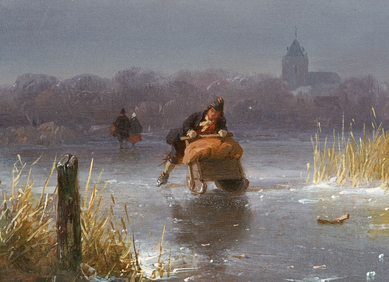 Andreas Schelfhout kunstwerk • schilderij • te koop IJsgezicht met jager en hond bij een paardenslee