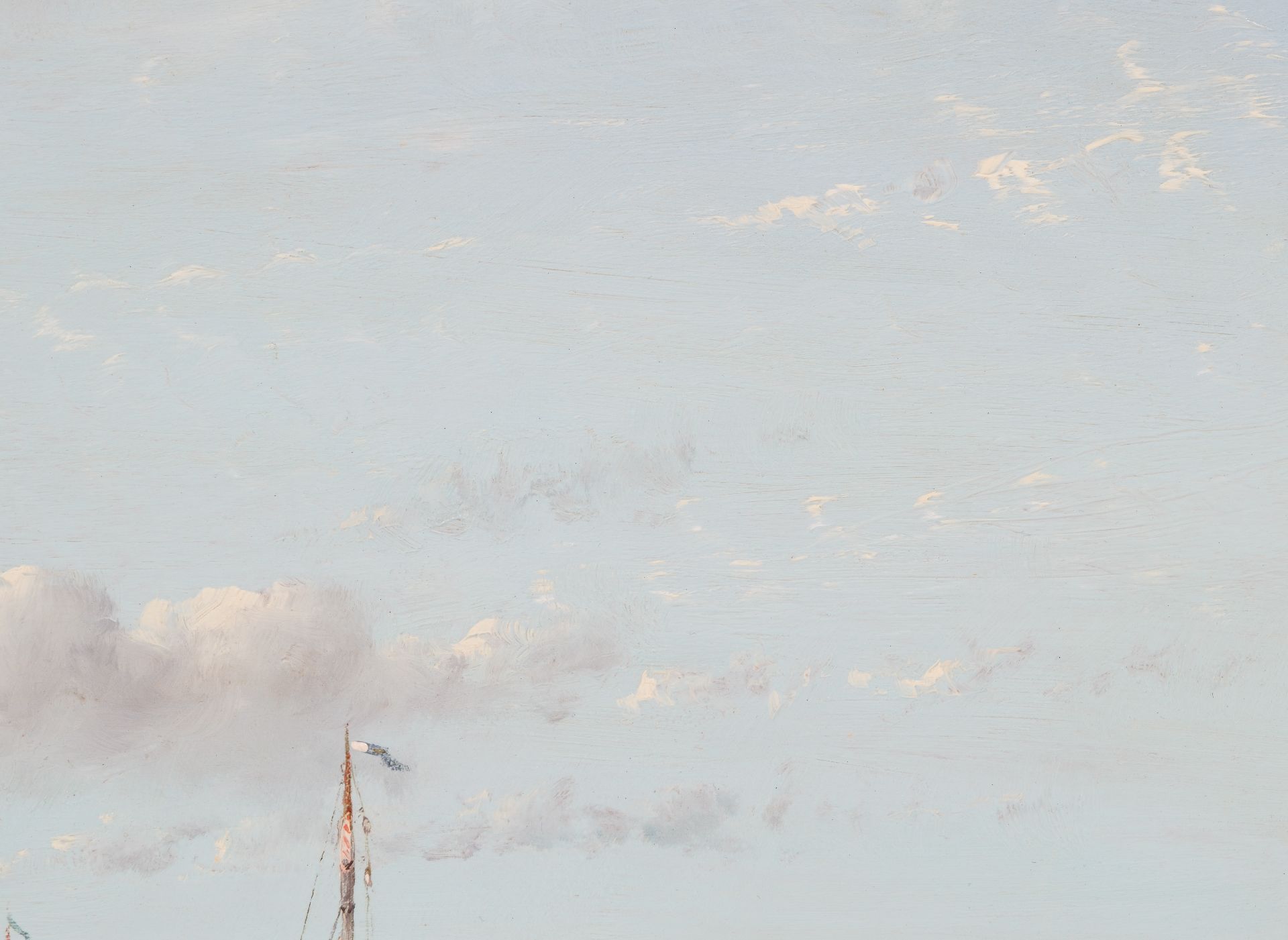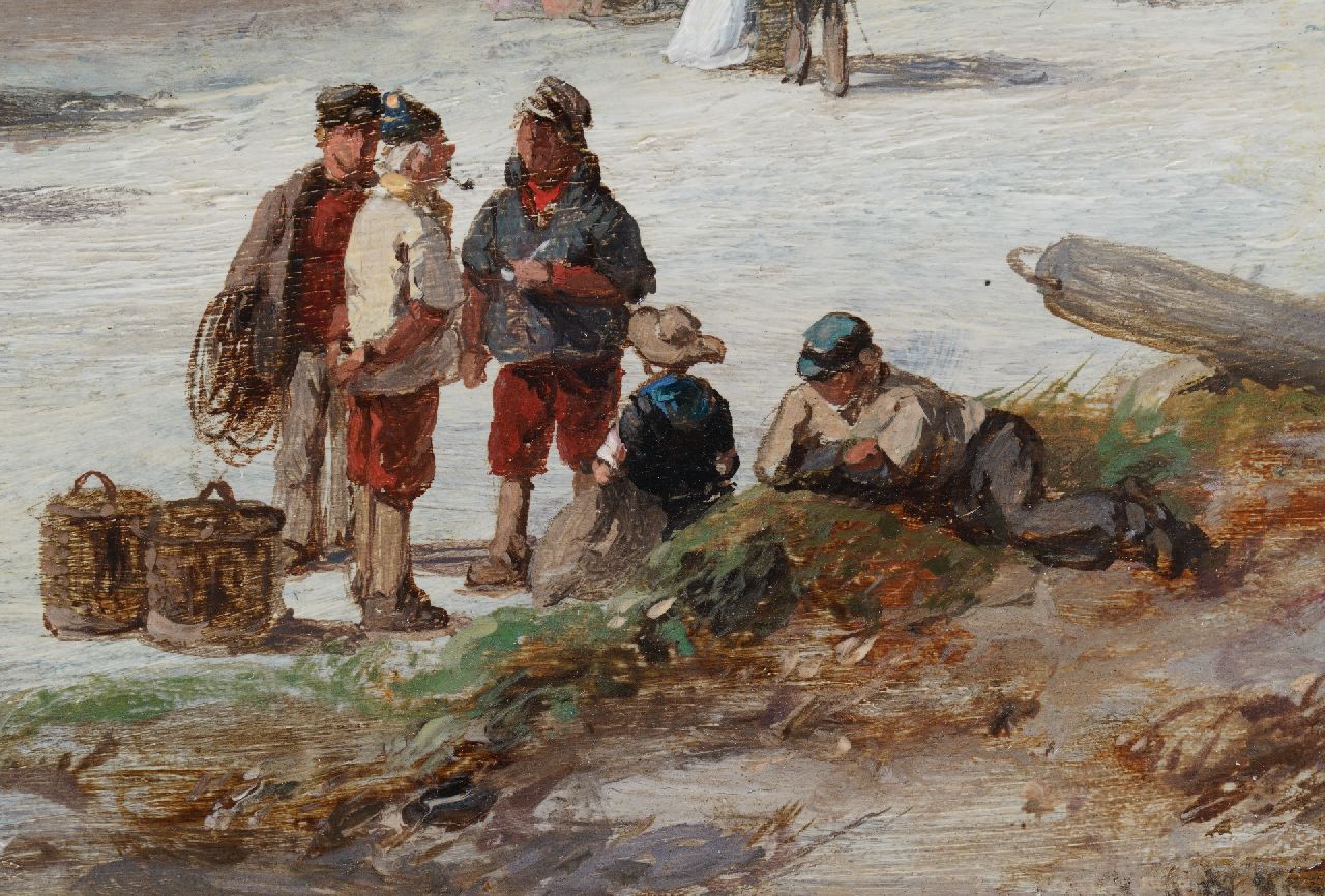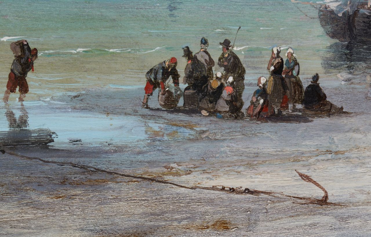 Schelfhout werkte vaak langs de Scheveningse kust en een van de eerste schilders in de 19e eeuw die zich richtte op het Hollandse strandgezicht. Hier introcuceert hij een nieuwigheidje, elegante wandelaars die zich op het strand mengen tussen de visverkopers. Rond die tijd diende zich voorzichtig het recreatieve verpozen in de buitenlucht aan. Schelfhout hield van dit soort contrasten. Het strandgezicht schilderde hij in kleine anekdotes, met groot technisch raffinement uitgewerkt.