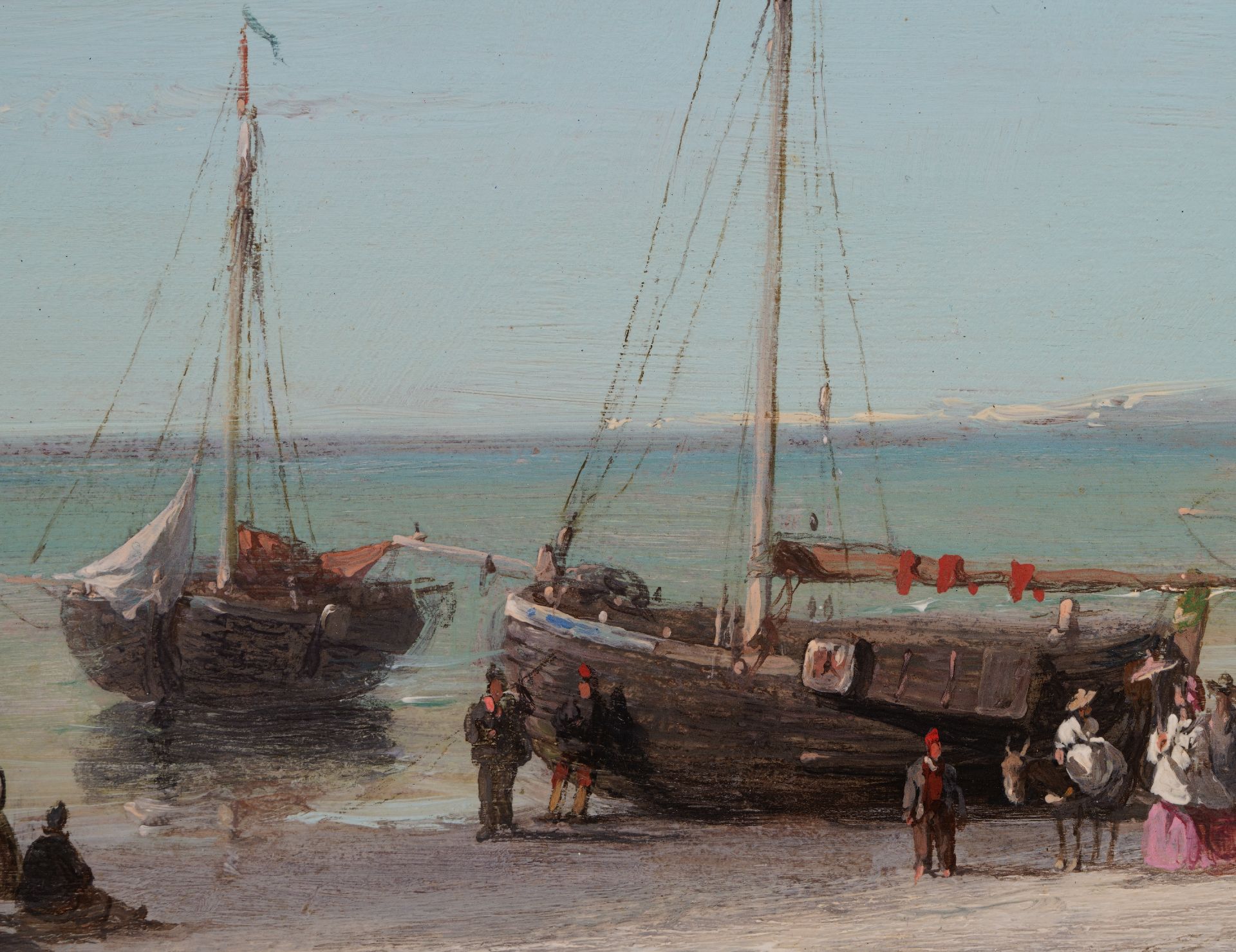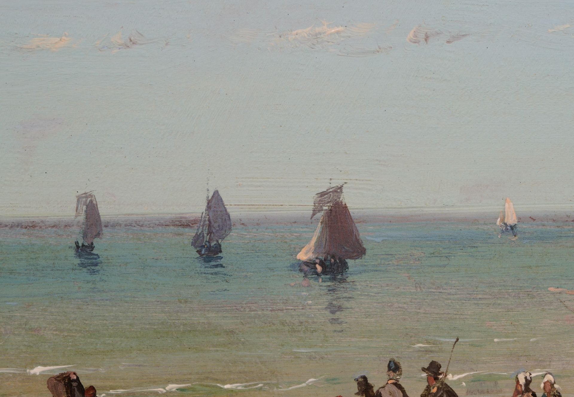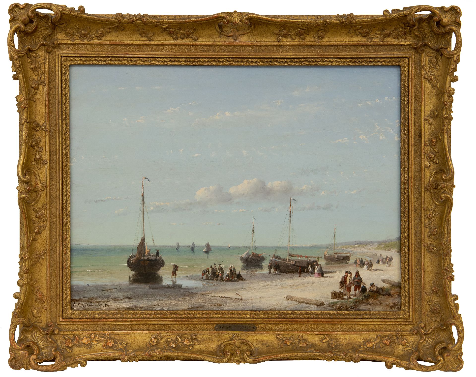 Andreas Schelfhout kunstwerk • schilderij • voorheen te koop Strandgezicht met schepen, vissers en elegante wandelaars