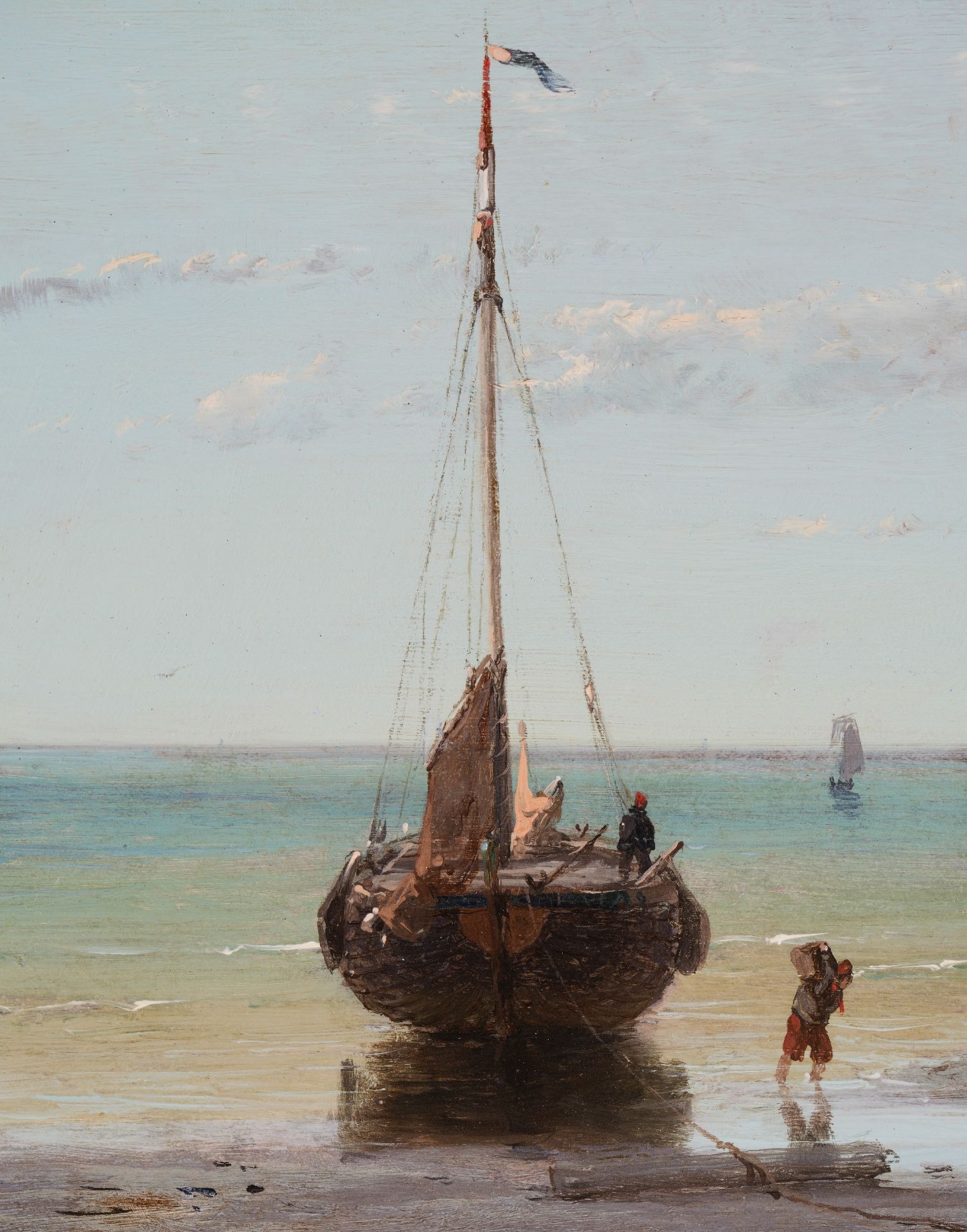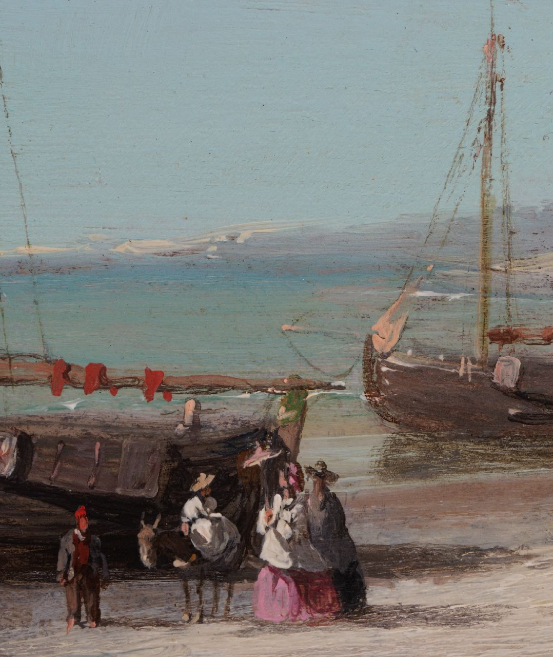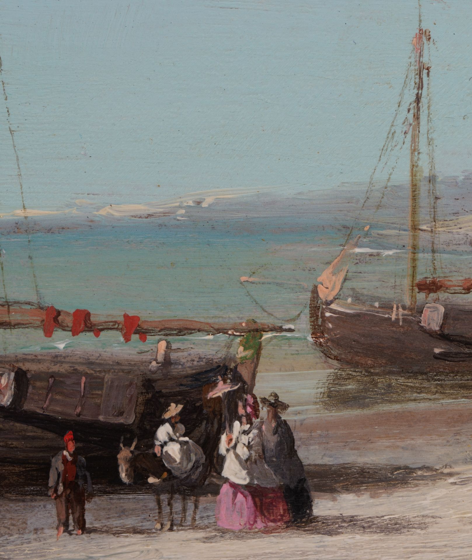 Andreas Schelfhout kunstwerk • schilderij • voorheen te koop Strandgezicht met schepen, vissers en elegante wandelaars