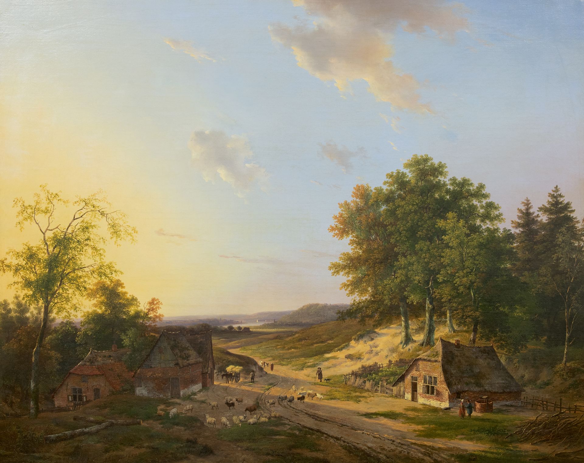 Andreas Schelfhout kunstwerk • schilderij • voorheen te koop Weids rivierlandschap met schaapherder en landvolk