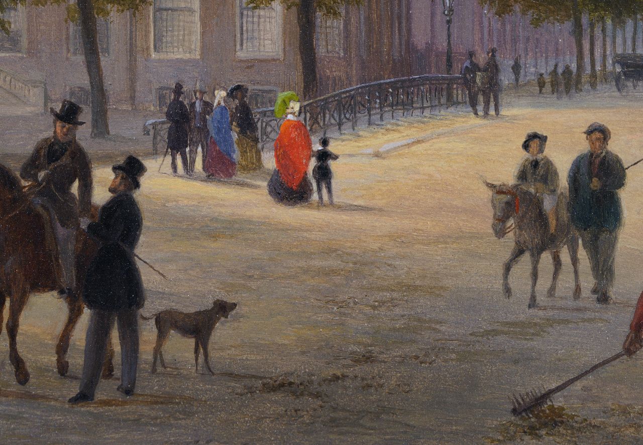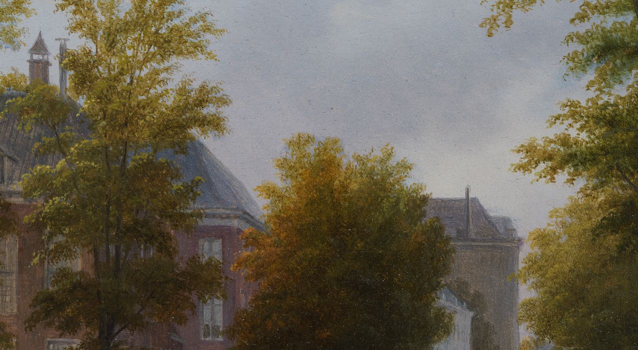B.J. van Hove was een leerling van de Haagse decoratieschilder J.H.A.A. Breckenheijmer, later van de Haagse Tekenacademie. Hij was in zijn tijd al een belangrijk schilder van romantische stadsgezichten waarin fantasie een grote rol speelde. Daarnaast was hij werkzaam als toneel- en decorschilder. In 1829 werd hij decorateur van de Koninklijke Nederlandsche Schouwburg in Den Haag. Van Hove speelde een belangrijke rol in de ontwikkeling van de 19e-eeuwse schilderkunst door zijn vele leerlingen, onder wie J. Bosboom, Verveer en H.J. Weissenbruch. In dit Haagse stadsgezicht is rechts het wachthuis of 'Wachtje' zichtbaar, dat door Zeger Reyers in 1827/1828 werd gebouwd in opdracht van koning Willem I. Het gebouwtje, dat gebruikt werd om accijns te innen, lag bij de Bosbrug langs de weg tussen het Korte Voorhout en het Malieveld. Het gebouw raakte tijdens de Tweede Wereldoorlog beschadigd en werd na 1947 afgebroken. Links achter het kleine huisje is de officiele woning van de Admiraal van de Staatse Vloot zichtbaar.