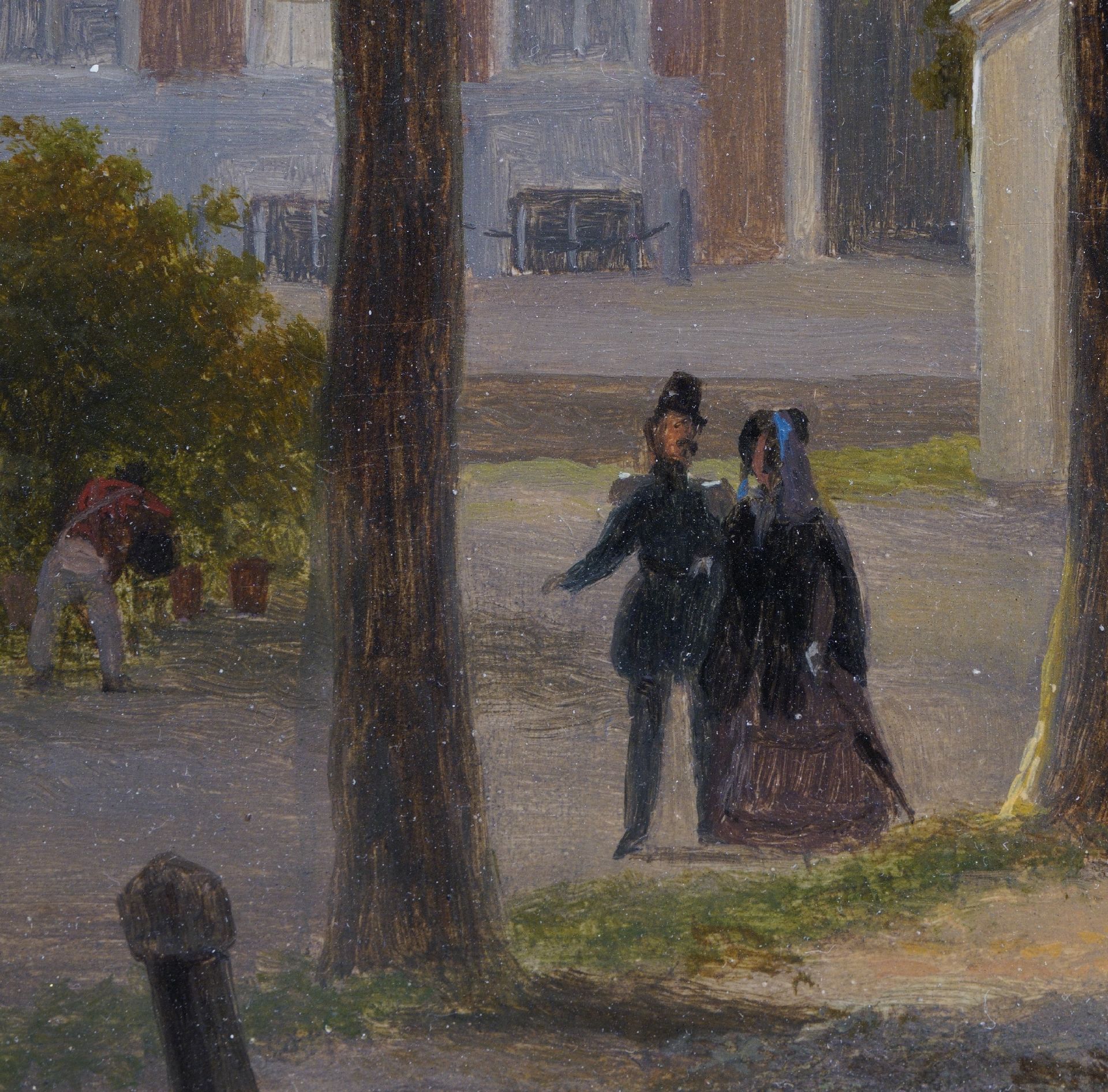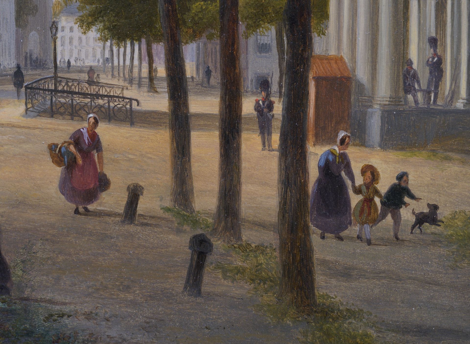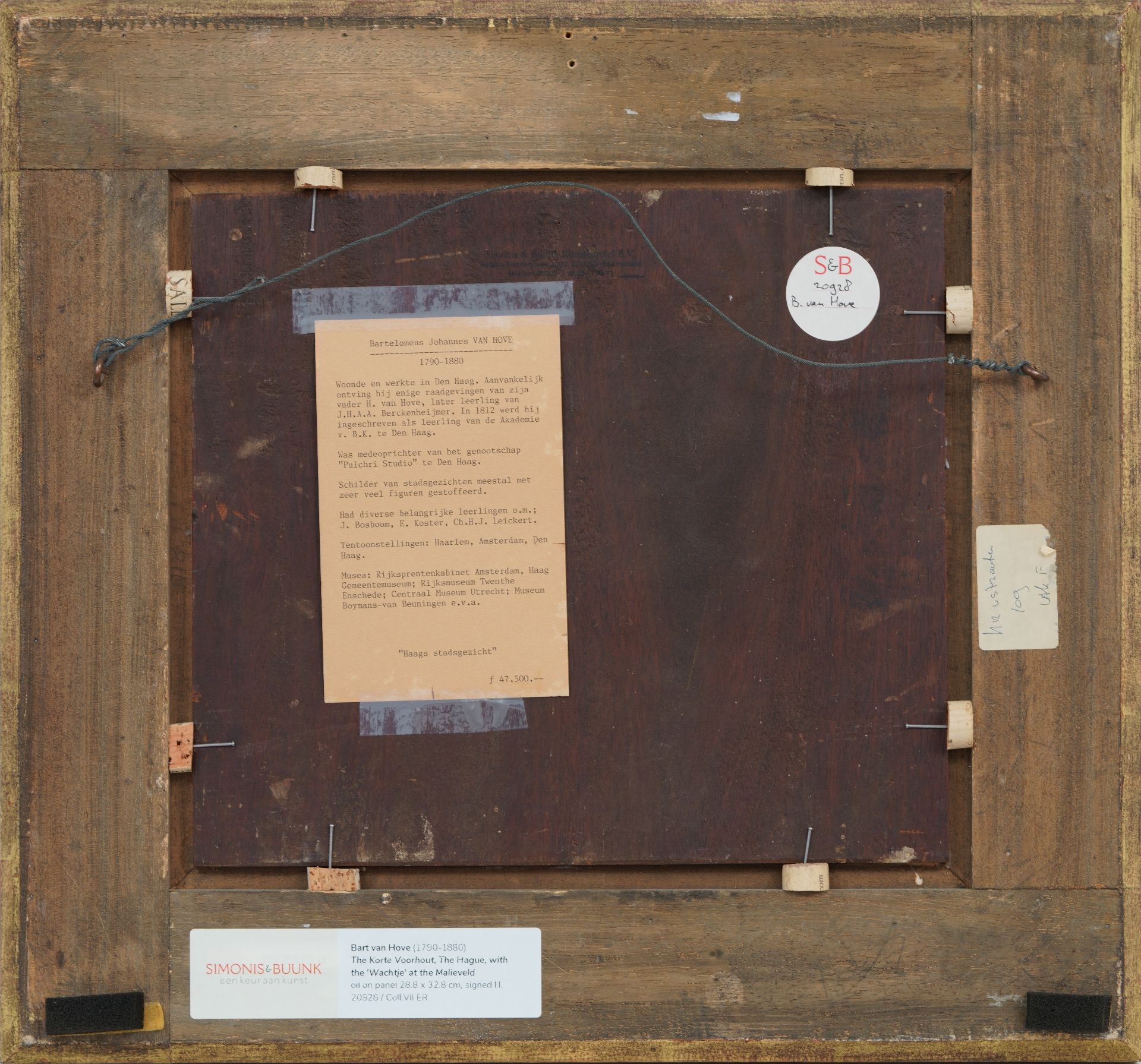 B.J. van Hove was een leerling van de Haagse decoratieschilder J.H.A.A. Breckenheijmer, later van de Haagse Tekenacademie. Hij was in zijn tijd al een belangrijk schilder van romantische stadsgezichten waarin fantasie een grote rol speelde. Daarnaast was hij werkzaam als toneel- en decorschilder. In 1829 werd hij decorateur van de Koninklijke Nederlandsche Schouwburg in Den Haag. Van Hove speelde een belangrijke rol in de ontwikkeling van de 19e-eeuwse schilderkunst door zijn vele leerlingen, onder wie J. Bosboom, Verveer en H.J. Weissenbruch. In dit Haagse stadsgezicht is rechts het wachthuis of 'Wachtje' zichtbaar, dat door Zeger Reyers in 1827/1828 werd gebouwd in opdracht van koning Willem I. Het gebouwtje, dat gebruikt werd om accijns te innen, lag bij de Bosbrug langs de weg tussen het Korte Voorhout en het Malieveld. Het gebouw raakte tijdens de Tweede Wereldoorlog beschadigd en werd na 1947 afgebroken. Links achter het kleine huisje is de officiele woning van de Admiraal van de Staatse Vloot zichtbaar.