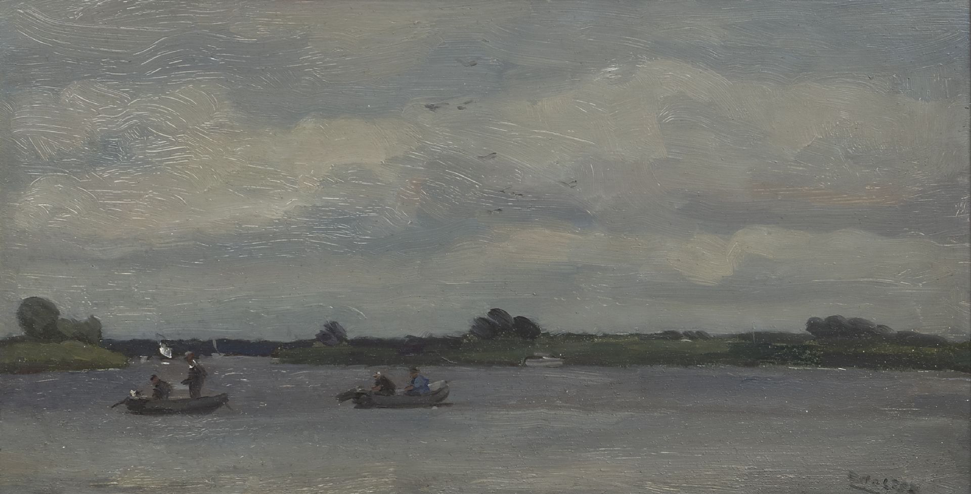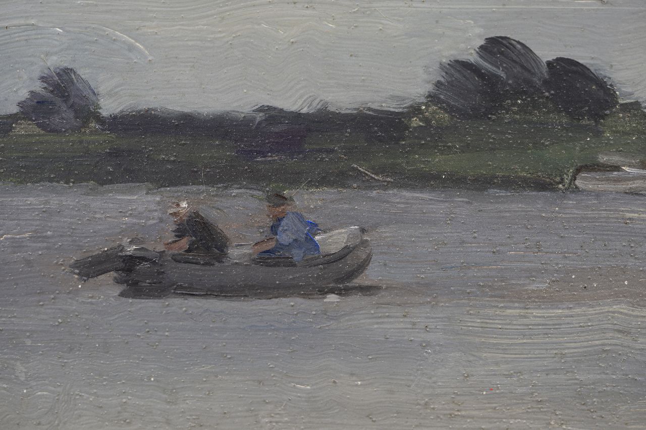 Cor Noltee kunstwerk • schilderij • voorheen te koop Vissers in bootjes met buitenboordmotor op het Wantij, Dordrecht