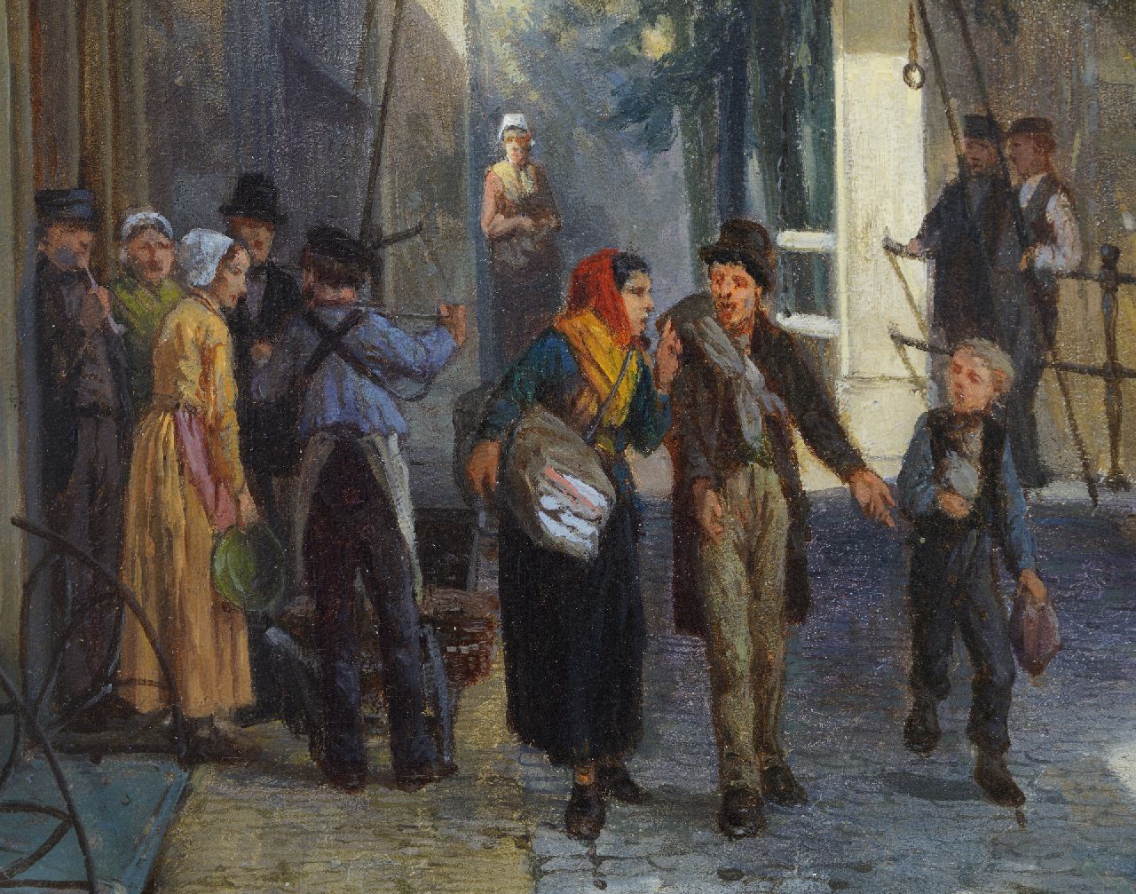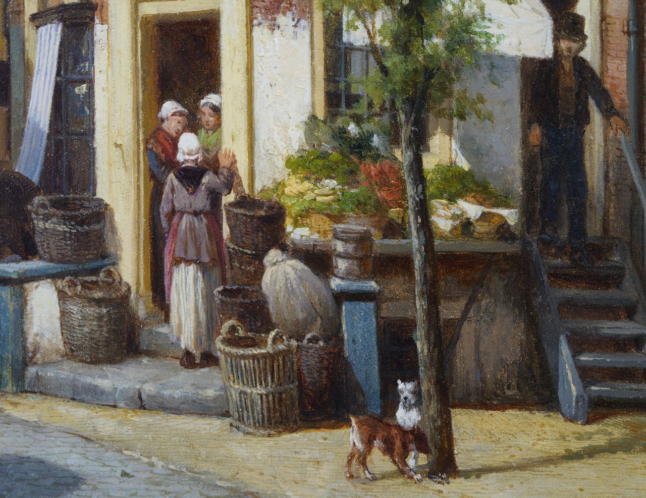 Cornelis Springer kunstwerk • schilderij • voorheen te koop Drukbevolkt straatje 'Binnenveer' in Weesp