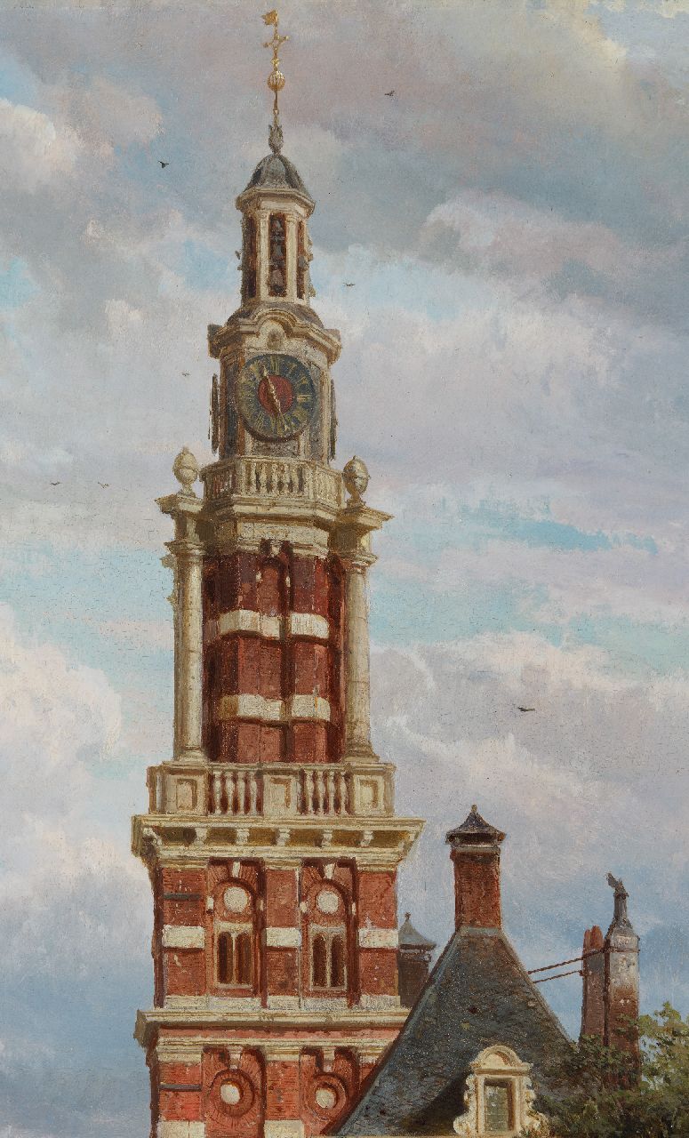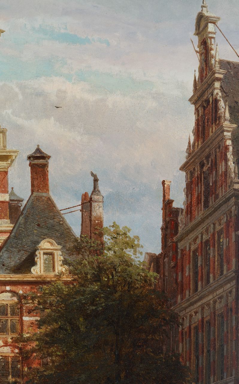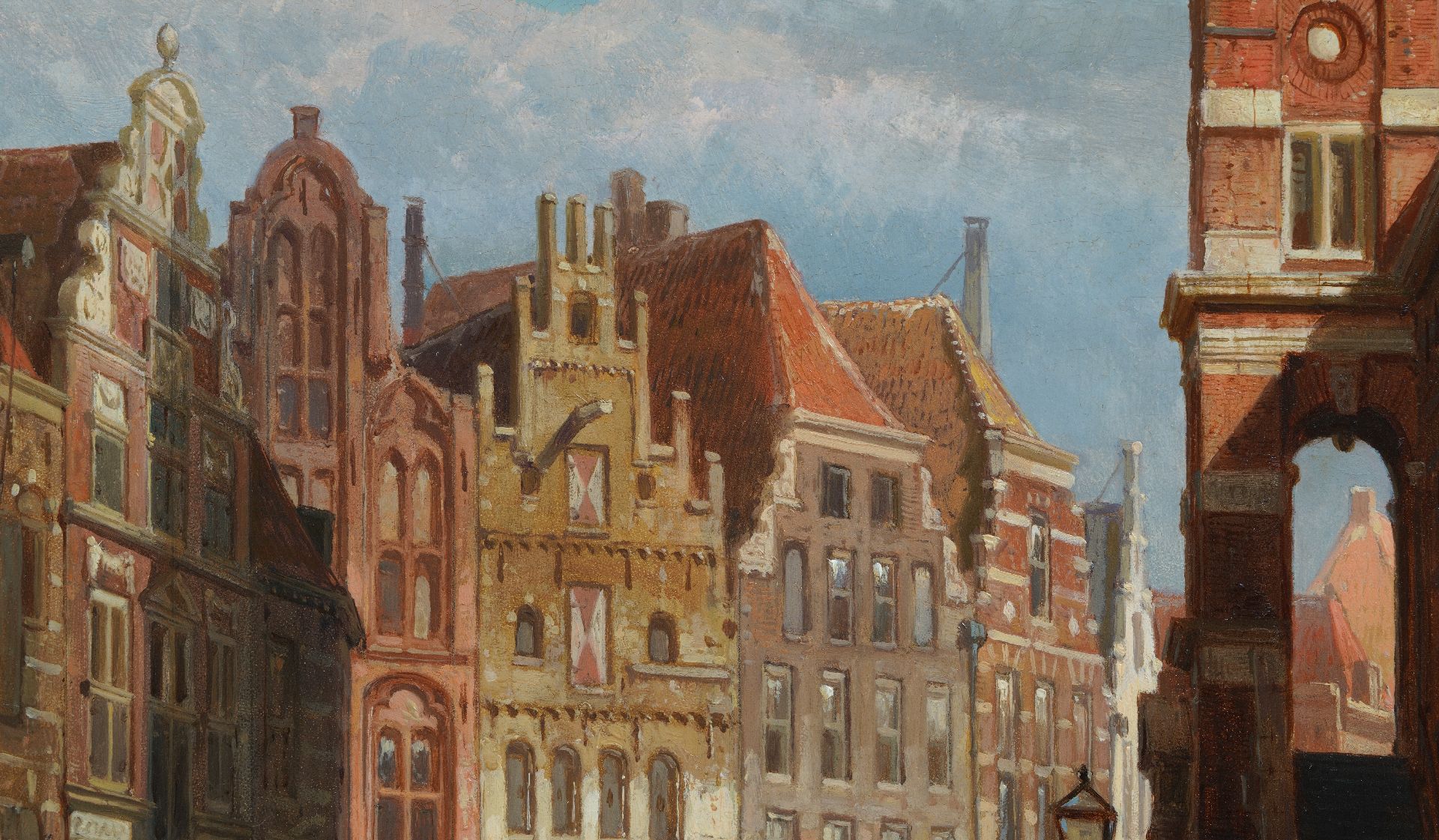 Cornelis Springer schilderde vooral stads- en dorpsgezichten waarin gevels en levendige stoffage baden in een warm zonlicht. Samen met Barend Cornelis Koekkoek en Andreas Schelfhout behoort hij tot de belangrijkste schilders van de Hollandse romantiek. In zijn schilderijen is vaak een prominente plaats toebedeeld aan gebouwen uit de 17e en 18e eeuw. Soms is dit een fantasie-architectuur, maar in de meeste gevallen waren dit bestaande gebouwen waarvan men rond 1850 de schoonheid 'herontdekte'. Springer maakte van deze gebouwen meestal eerst een uitvoerige schets, die hij dan later tot schilderij uitwerkte.