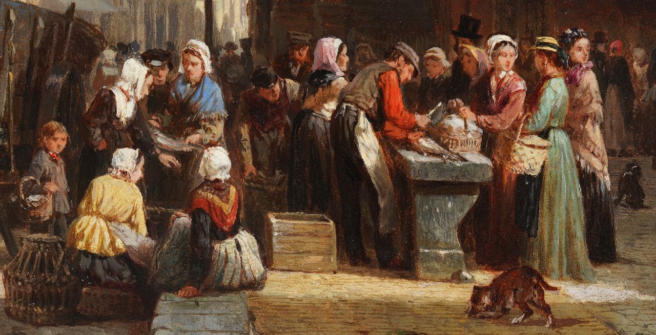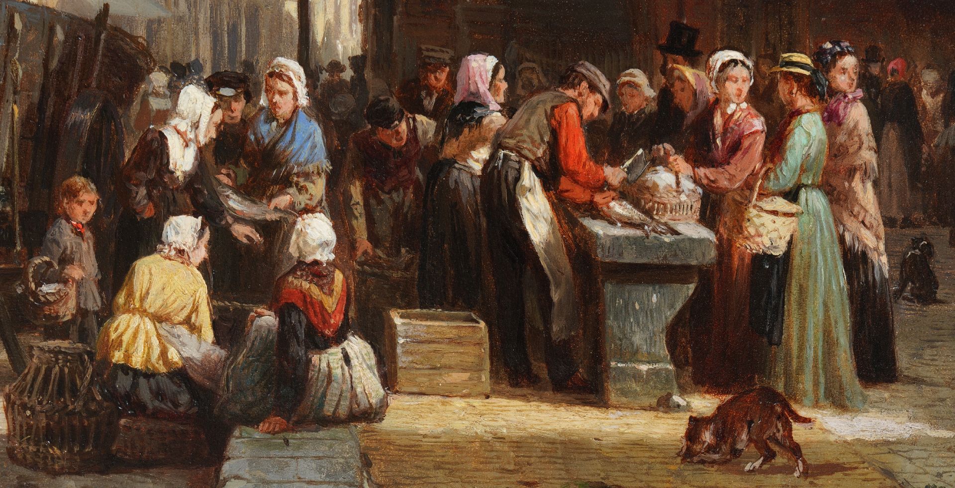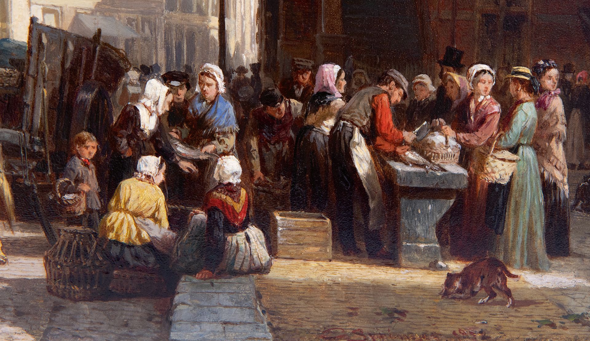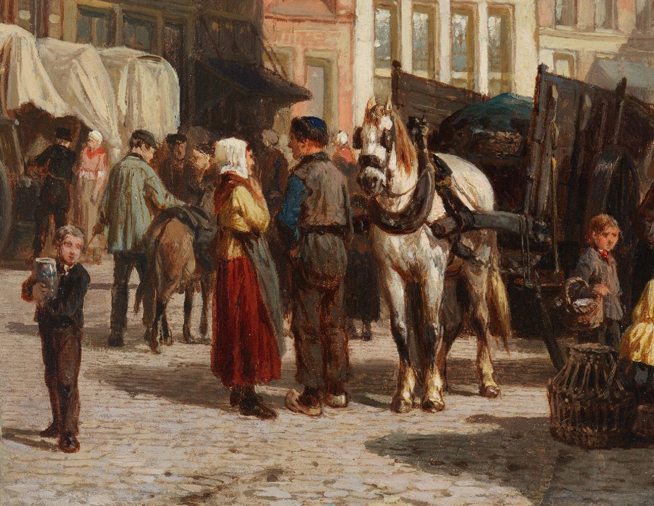 Cornelis Springer kunstwerk • schilderij • voorheen te koop Drukbevolkte markt voor de Wijnhuistoren in Zutphen