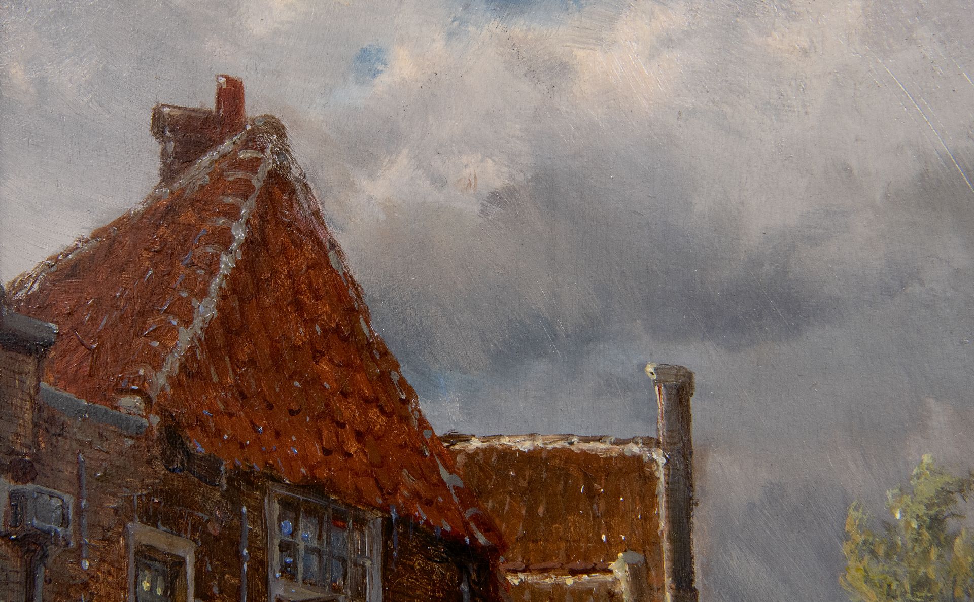Met verso authenticiteitsverklaring van de schilder op verzegeld etiket: 'De ondergetekende verklaart dat dit schilderijtje voorstellende Gezicht te Oudewater bij regenachtig weder door hem is vervaardigd, C. Springer, Amsterdam 21 April 80'
