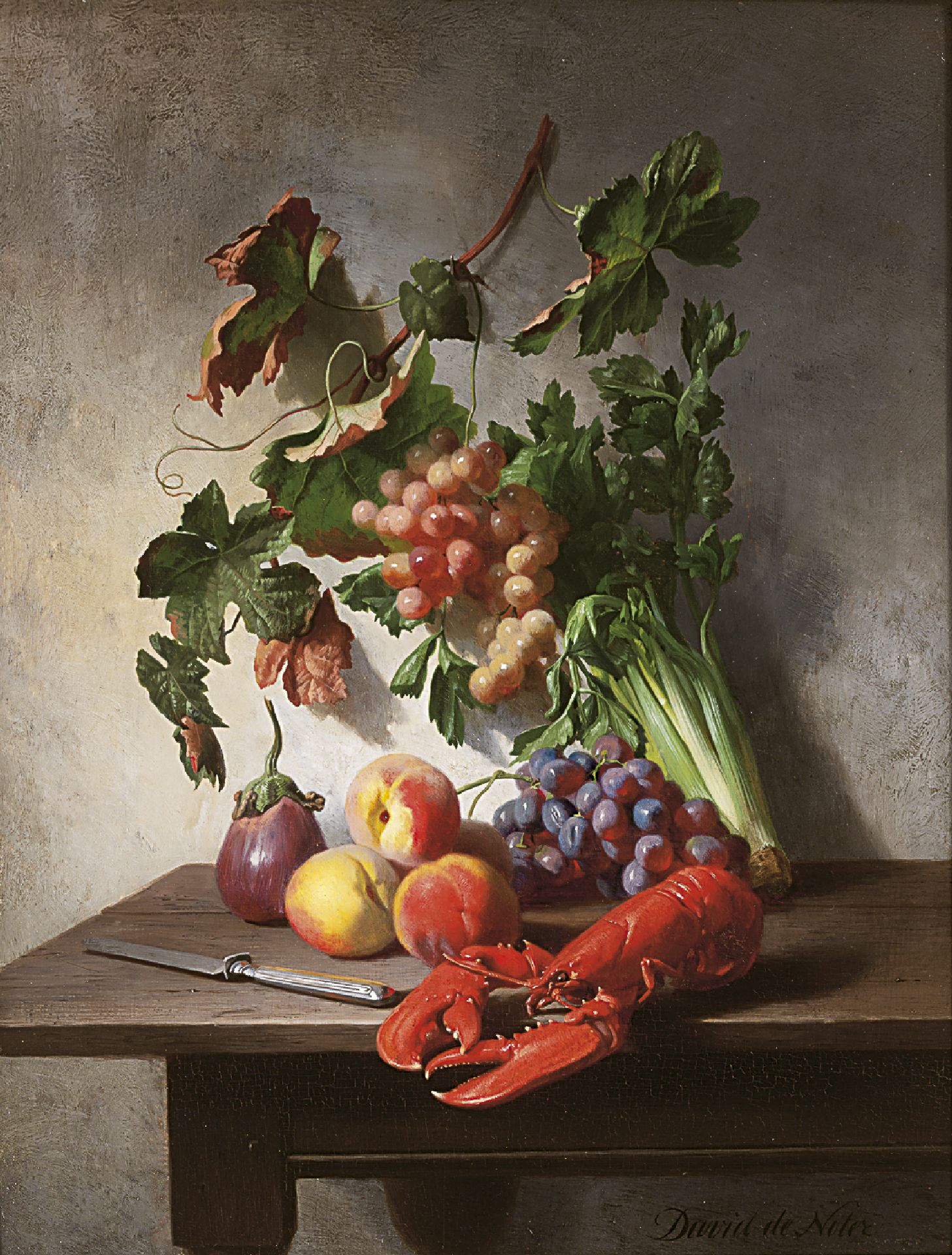 David de Noter kunstwerk • schilderij • te koop Stilleven met groente, fruit, kreeft en een mes