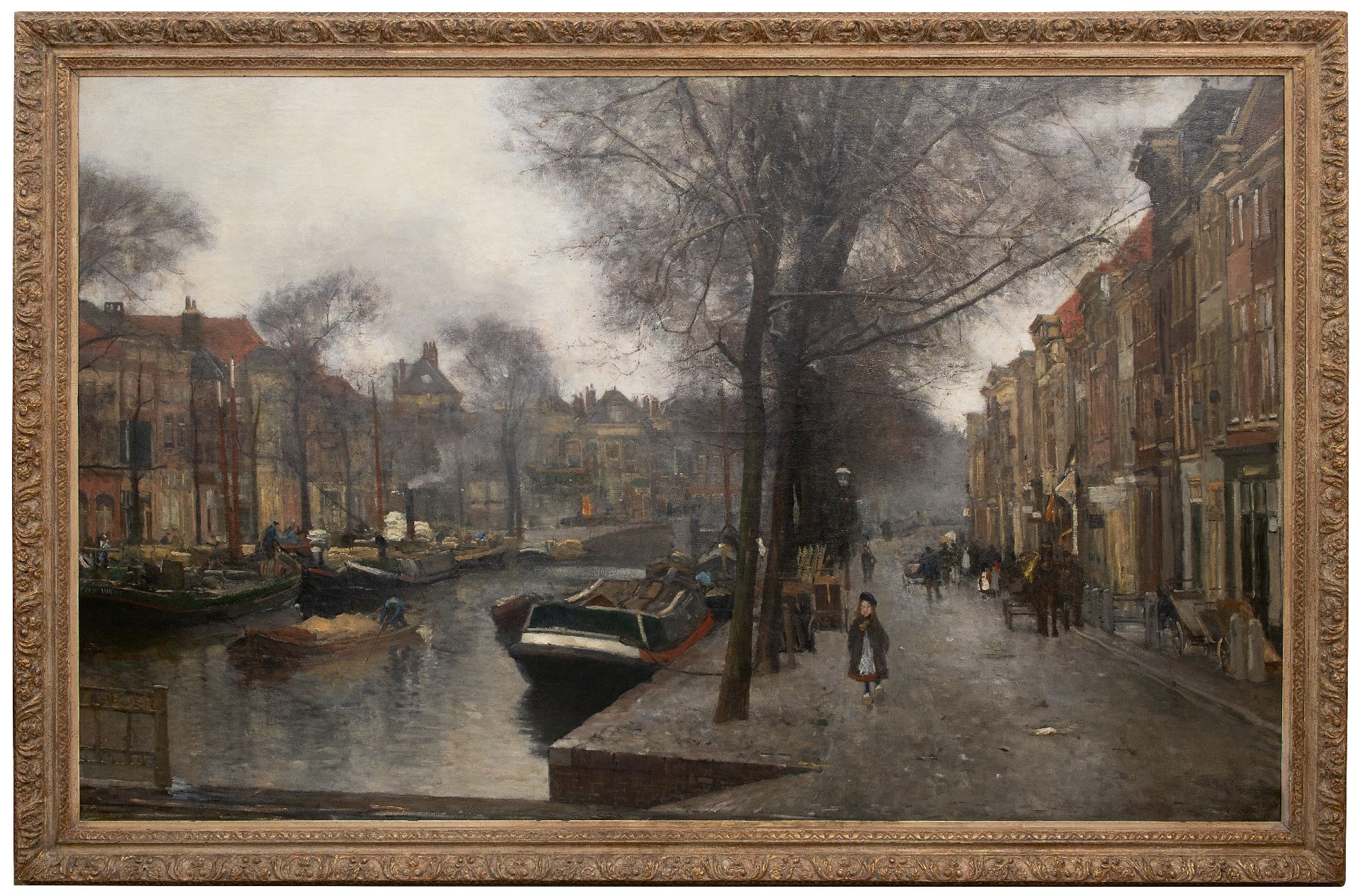 Floris Arntzenius spontane impressies van Haagse straatjes waarop hij de drukte van de stad verbeeldt zijn gewild. Als de ‘Haagse Breitner’ is hij op zoek naar ‘woelige straattoneeltjes, liefst bij regenachtig weer, de drukte van een marktdag of een volkswijk.’ Hij schildert in sobere tinten afgewisseld met kleuraccenten als kobaltblauw, rood en groen. Zo ook dit gigantische schilderij (126 x 201 cm) van de Bierkade. Het is een wat grauwe dag, er is nog weinig activiteit. Een volgeladen schuit is vanaf Het Spui richting de Wagenbrug onderweg. Een schip met rokende schoorsteen staat op vertrekken. Op de voorgrond een jong meisje dat de schilder tegemoet loopt. Alles wat je van Artzenius wilt hebben, gevat in één groot doek. ‘Nou, als ik een goed straatje of een goed grachtje gevonden heb, dan ga ik eens rondsnuffelen of ‘k niet een raam kan huren. Want op de gracht zelf gaan zitten met je rommeltje kan je nou eenmaal niet: dan krijg je zoveel bekijks. En achter een raam zit je rustig, wat! Daar kijk ‘k alles zoo kalmpjes dan eens af: zoo van de Bierkade, ’t Zieken op met al die bedrijvigheid daar.’ Floris Arntzenius, Artistiek Weekblad, 1910.