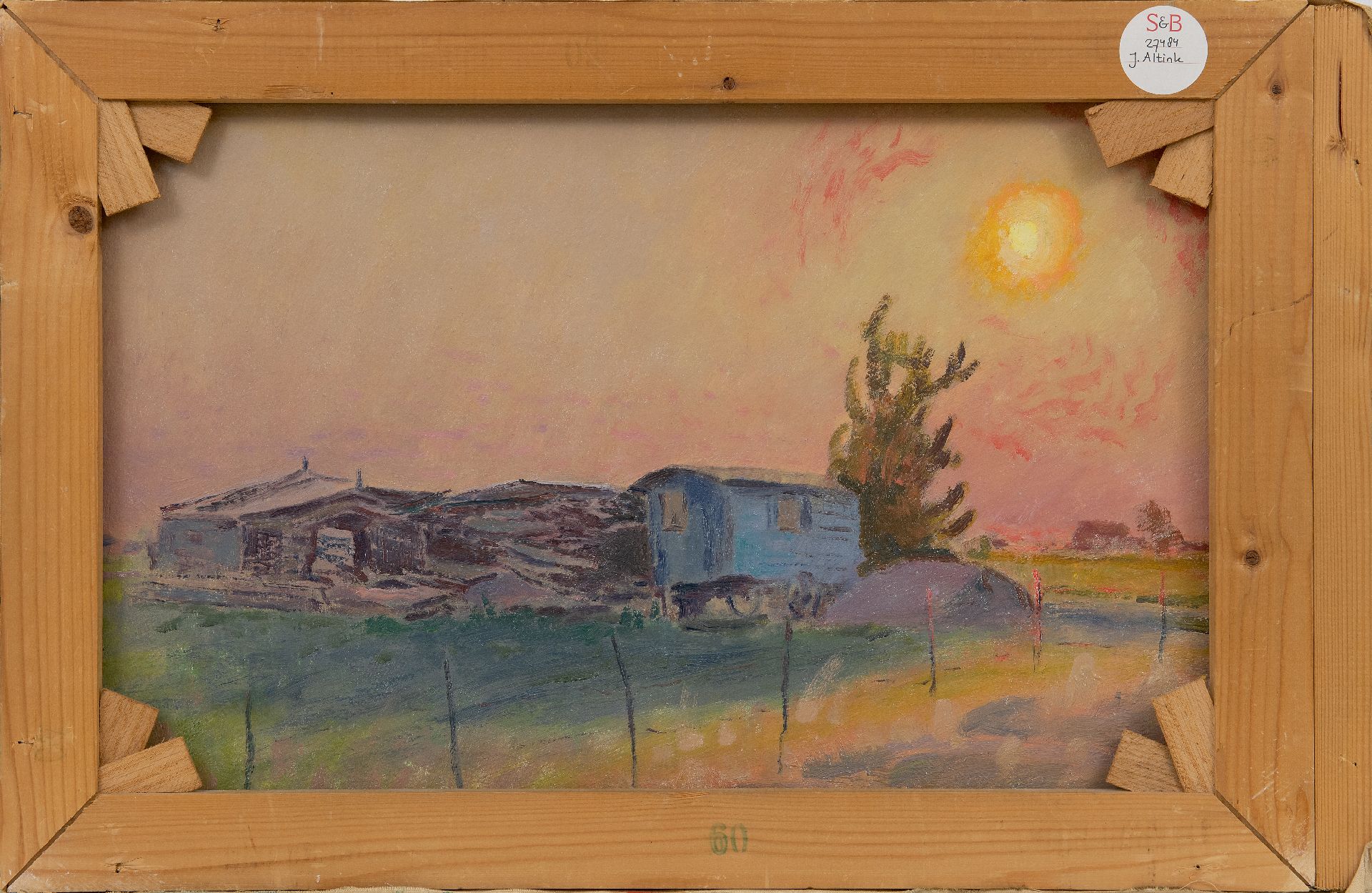 Jan Altink kunstwerk • schilderij • te koop Boerderij Blauwborgje aan het Reitdiep; verso: landschap met loods en schaftkeet