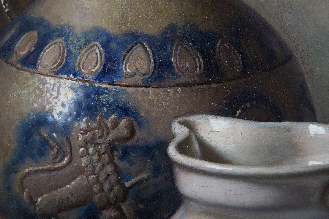 Jan Eversen kunstwerk • schilderij • te koop Stilleven met Westerwaldkruik, roemer, citroen en mosselen
