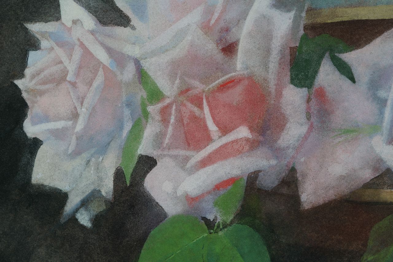 Het glanzende natuursteen waarop de schaal staat, laat de rozen bijna gewichtloos lijken. Eind jaren 80 begon Voerman met het schilderen in aquarelverf van de zachtroze La France-rozen. Deze zachtroze theeroos werd voor het eerst gekweekt rond 1867 door de Franse kweker Jean-Baptiste André Guillot (1827– 1893) en tijdens de wereldtentoonstelling van 1867 werd de roos uitverkoren om de de naam ‘La France’ te dragen. Door de mooie vorm, kleur, rijke bloei en heerlijke geur was en is het een geliefde roos voor in de tuin. ‘De hem zeer dierbare La France-rozen, met hoekig omgekrulde bloemblaadjes en een gevuld vlezig hart, gaf hij weer in zeventiende eeuwse glazen of in platte schalen, sterk gestileerd, in vaste kleur met zo weinig mogelijk schaduwtinten.’ Aldus Anna Wagner.