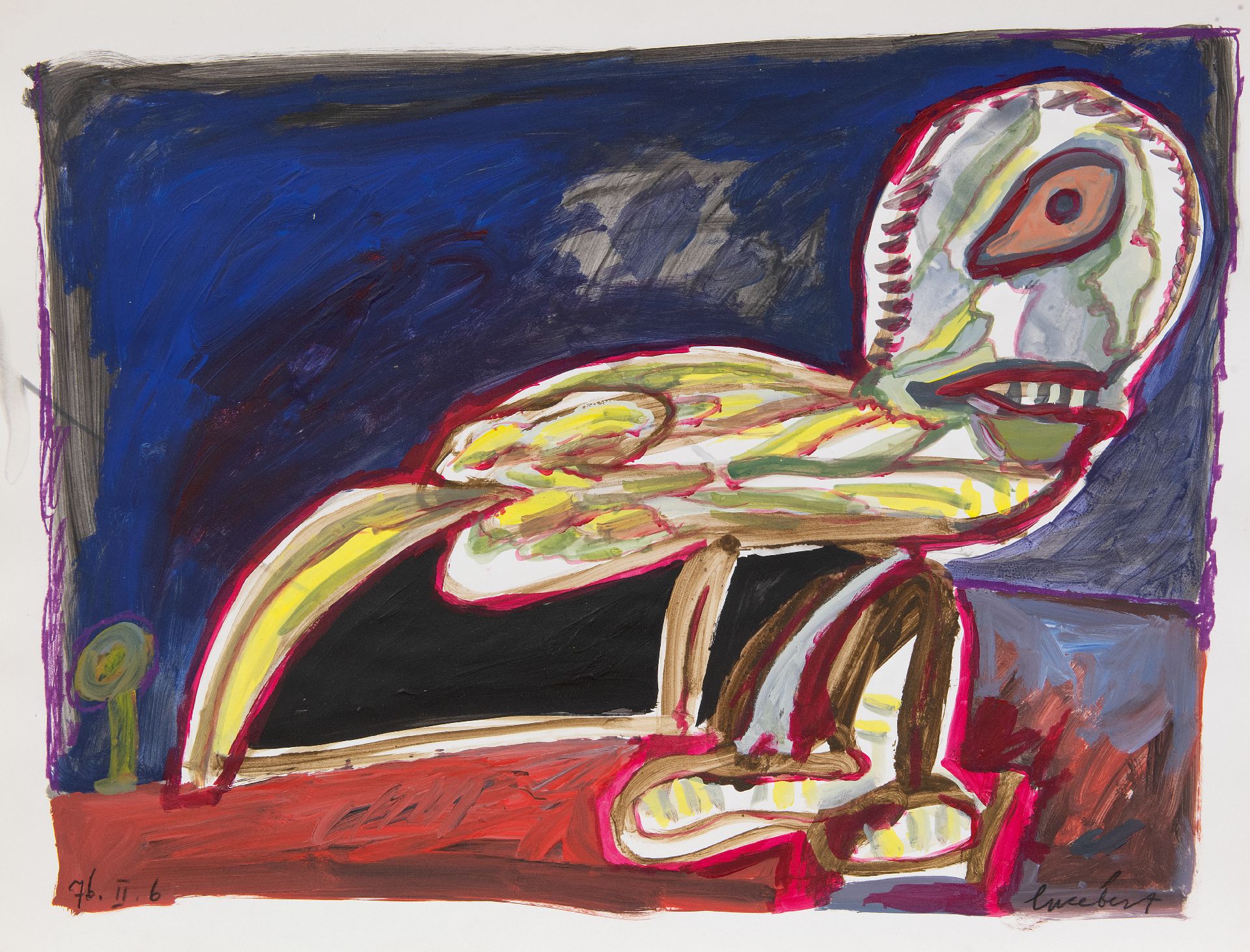 Lucebert was een experimenteel schilder-tekenaar-dichter en in die laatste hoedanigheid één van de hoofdfiguren van de CoBrA-beweging. Zijn werk wordt gekenmerkt door een grote vrijheid en spontaniteit. Hij schilderde wat er in hem opkwam, zonder zich te houden aan vaste motieven. Vanaf de jaren 50 bouwde hij zijn tekeningen en gouaches op uit stippels, lijnen en krassen, waar overheen de - bewust - onbeholpen vormen van lichamen van mensen en fantasiewezens werden geschilderd. Zijn sterk experimentele inslag bracht met zich mee dat Lucebert ook op veel andere gebieden actief was: hij fotografeerde, maakte keramiek, schreef toneelteksten en maakte monumentale wandschilderingen.