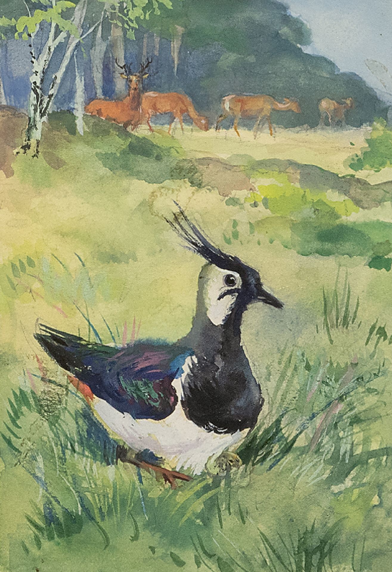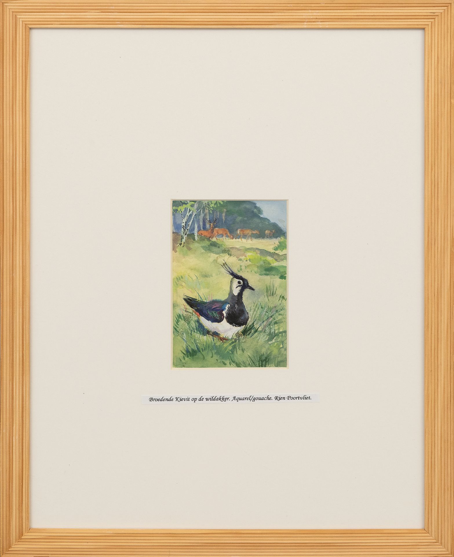 Rien Poortvliet kunstwerk • aquarel • tekening • te koop Broedende Kievit in de open wei, met reeën Hoge Veluwe
