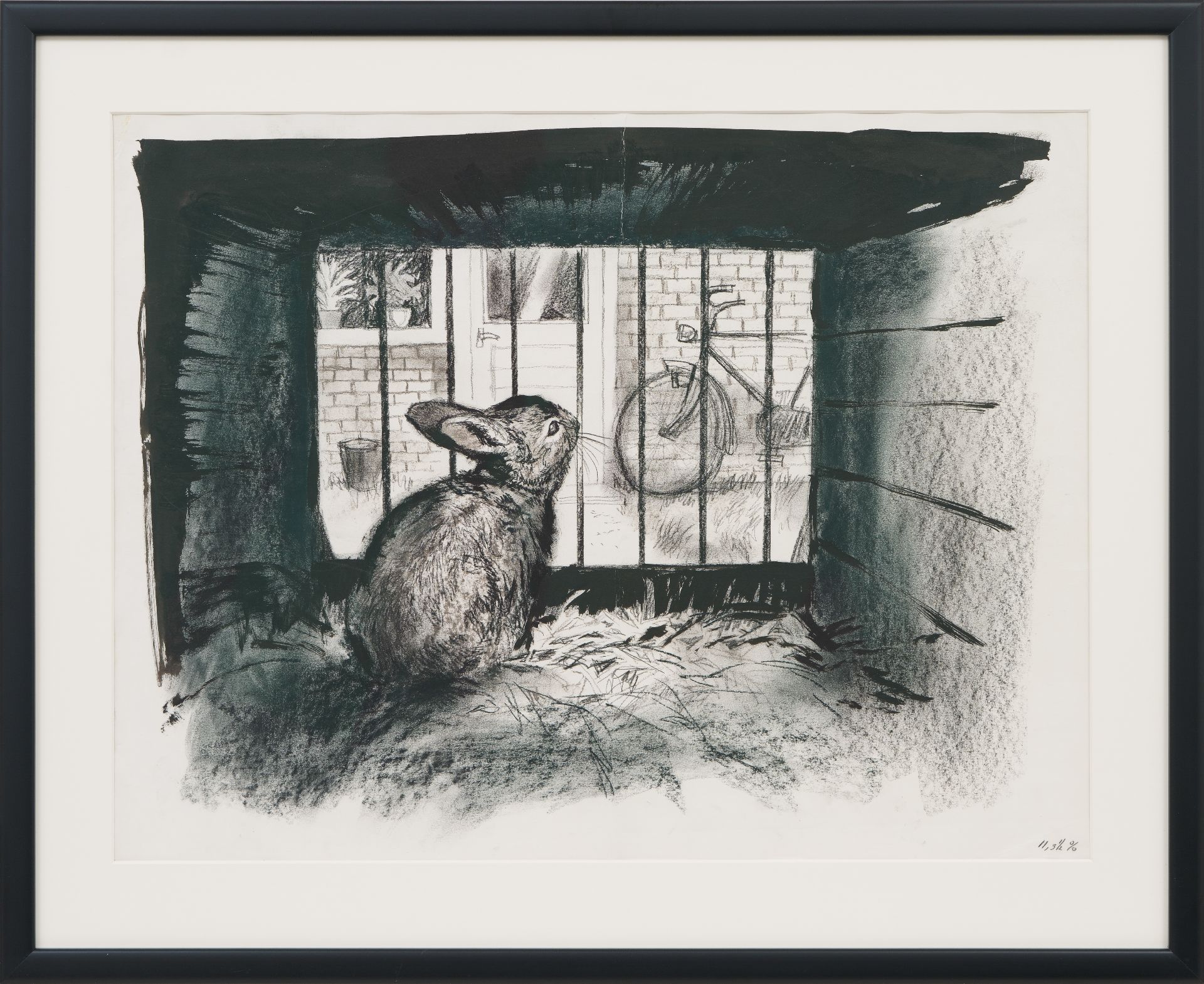 Rien Poortvliet kunstwerk • aquarel • tekening • voorheen te koop Konijntje in hok