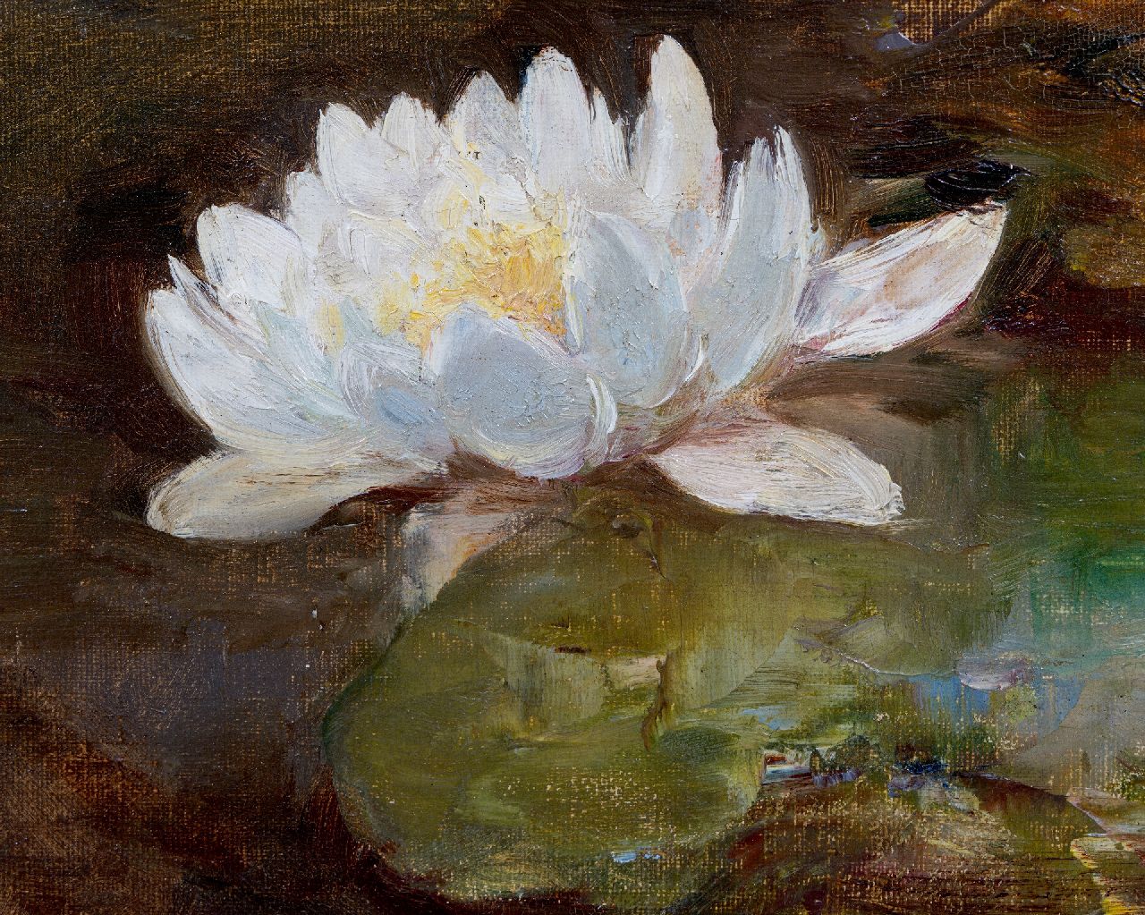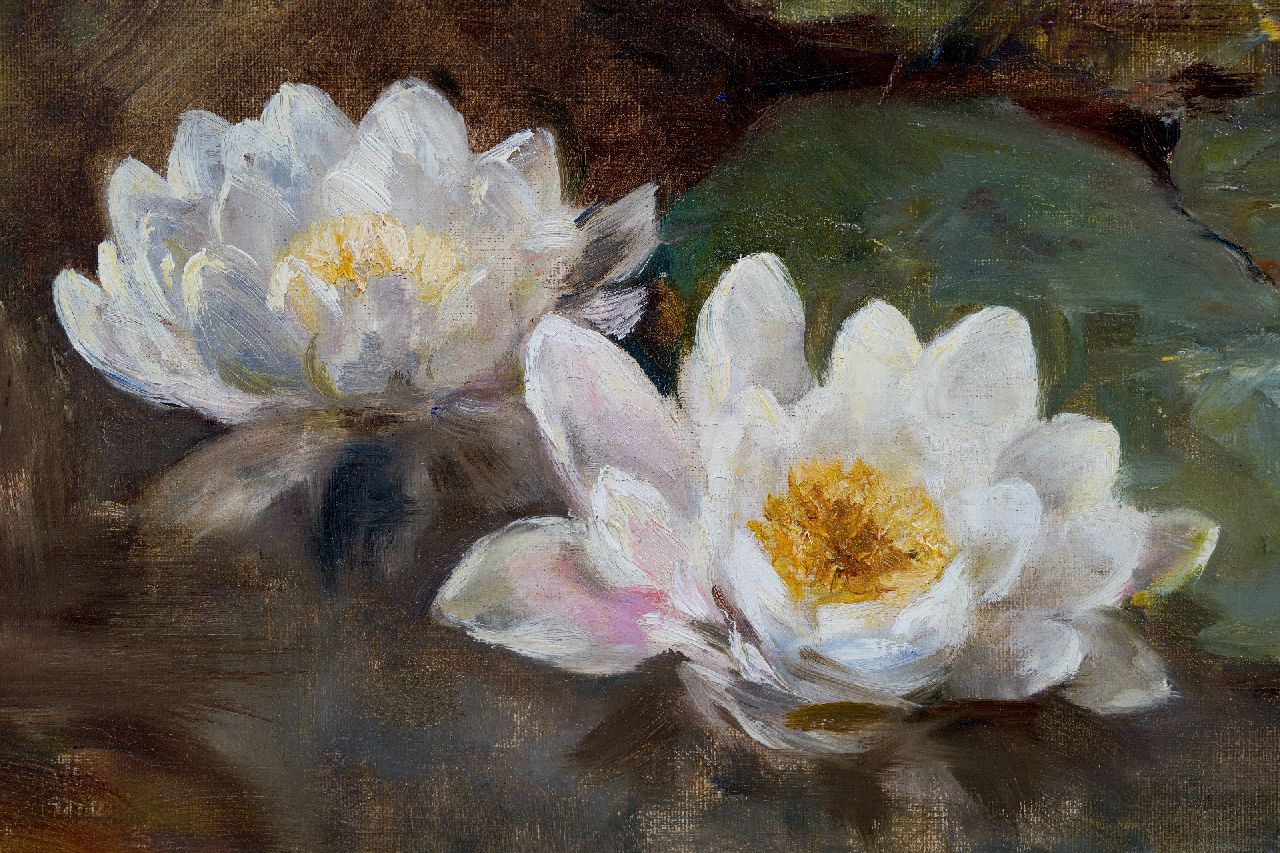 Een Nederlandse Monet! Een zeldzaam werk in het oeuvre van Roelofs, die we vooral van zijn Hollandse landschappen kennen. Na zijn verhuizing in 1847 naar Brussel kwam hij jaarlijks naar Nederland om het polderlandschap te schilderen. Hij zag er molens en drassige weiden onder zware wolkenluchten, waar koeien graasden aan de waterkant. Maar ook trof hij er de witte waterlelie aan in de ondiepe sloten en plassen van het laagveengebied rond de Nieuwkoopse Plassen en bij Loosdrecht. Meestal speelt deze een ondergeschikte rol op de achtergrond van zijn schilderijen. Maar op dit bijzondere werk van Roelofs kreeg de waterlelie de hoofdrol zoals Monet deed dit een paar decennia later zou doen dit tussen 1914-1926 op zijn serie schilderijen met waterlelies voor het Musée de l'Orangerie in Parijs. Roelofs zal een studie van de lelies gemaakt hebben zoals hij dat vaak deed tijdens zijn ontdekkingstochten in de natuur. Deze studies dienden als geheugensteuntje voor de uitwerking van een schets in het atelier en moesten volgens hem ‘de adem der natuur’ in zich hebben.