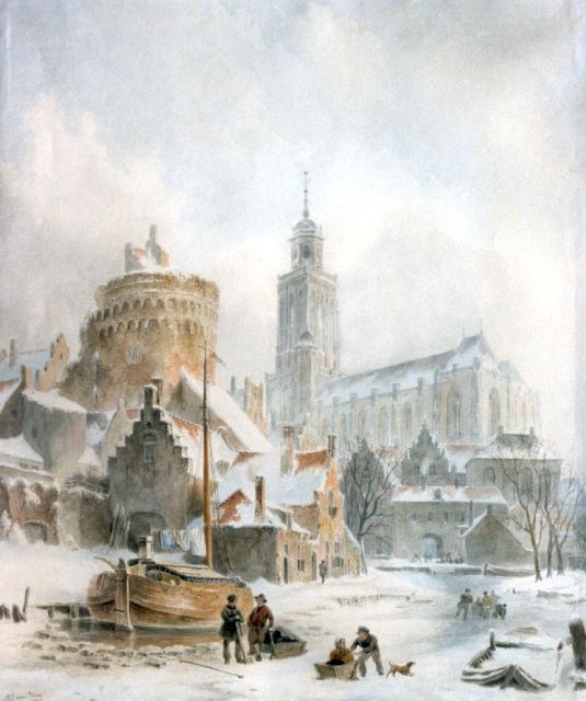 A quay and town gate in winter (pendant from A view of a town with townsfolk and shipping on a canal; only as a pair)