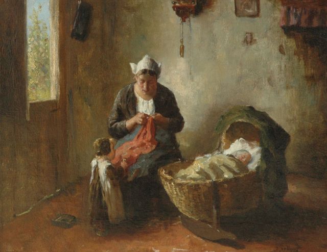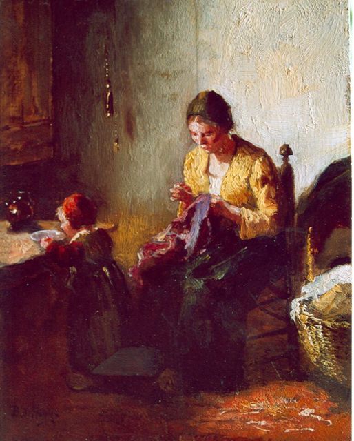 Bernard de Hoog is best known as a painter of moody Dutch peasant interiors, a genre that became very popular in our country after 1880. He lived and worked in Amsterdam until he moved to Laren in 1899, where he was introduced to the work of painters such as Albert Neuhuys, Hendrik Kever and Evert Pieters. In his interiors, De Hoog generally emphasizes the figures, mostly mothers and children, who, in quietly continuing their daily activities, are the epitome of serene, domestic happiness. After 1924, when he lived in The Hague, De Hoog also painted fisherman's life and every now and then a landscape with cattle. Much of his work was bought by collectors in America, Canada and England.