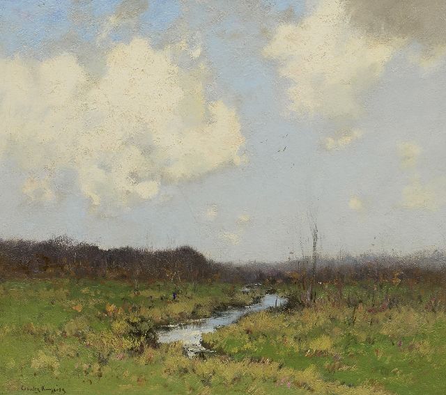 Cornelis Kuijpers is considered part of the after-flowering of the Hague School. His depiction of the landscape is strongly reminiscent of Willem Maris. Encouraged by his teachers at the Quellinus School in Amsterdam, Kuijpers took his easel into nature. First in Rijswijk and later in the wooded Renkum (1898-1910) he painted steamy meadows with ditches, flowering orchards and floating barges along the waterfront in a silver-gray and emerald-green palette. Together with Théophile de Bock and Charles Dankmeijer, among others, he exhibited his work at exhibitions of the Renkum artists' association Pictura Veluvensis.