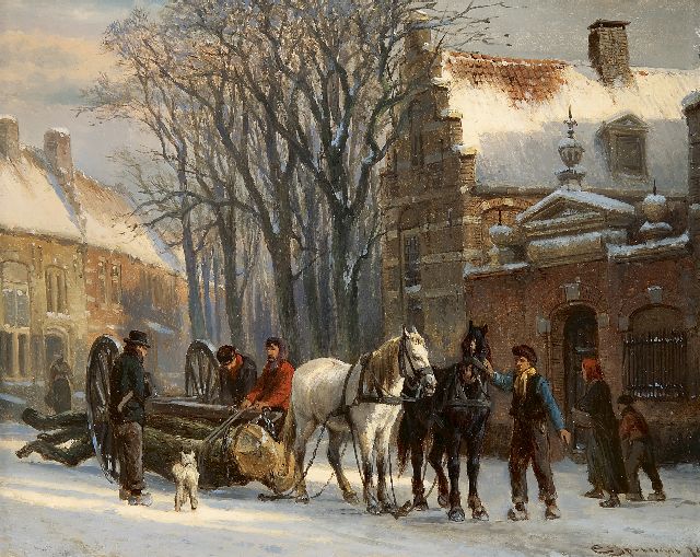 Cornelis Springer (1817-1891) mainly painted city and village views in which facades and lively fabrics are bathed in warm sunlight. Together with Barend Cornelis Koekkoek and Andreas Schelfhout, he is one of the most important painters of Dutch Romanticism. In his paintings, a prominent place is often assigned to buildings from the 17th and 18th centuries. Sometimes this is a fantasy architecture, but in most cases these were existing buildings whose beauty was 'rediscovered' around 1850. After the Netherlands was liberated from French oppression in 1813, the country developed a need for identity and national pride. The Golden Age, a period of great economic prosperity and wealth, was taken as an example; Rembrandt was elevated to Holland's most famous painter, Michiel de Ruyter became a national hero. It is therefore not surprising that the eye of painters such as Cornelis Springer, who came from a family of architects, fell on the buildings dating from that heyday