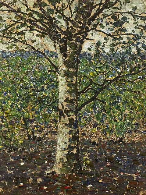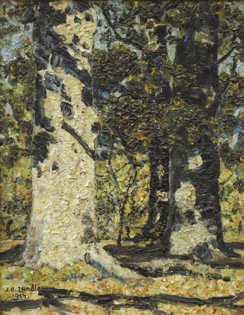 In 1902, at the age of 34, Jan Adam Zandleven chose to paint, on the advice - as the story goes - of Jozef Israels and P.J.C. Gabriel. Two years later, the painter moved to Gorssel, where he developed further on his own. Important was his introduction to H.P. Bremmer, who recognized his talent and advised Hélène Kröller-Müller to buy work from Zandleven, which she did. In 1912 he settled in Putten on the Veluwe. The painter felt most in his element when he could retreat with his easel to the forest, far from the bustle of the city. Under his hands there were enchanting paintings of birch and beech that light up in the shadow of the forest. Initially Zandleven painted landscapes, later also village views, still lifes and interiors; like trees painted in a broad pointillism with small, thick dots of paint. His canvases show traces of long-term attention to the subject and an endless work through in the paint.