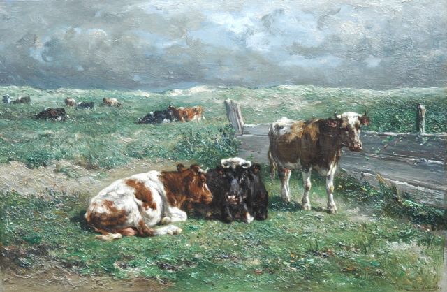 Jan de Haas was a masterful painter of cows, producing landscapes with prosperous red-and-white and Frisian cattle and other robustly modelled animals. The landscape is clearly secondary to the animals in his work. Following in the footsteps of Willem Roelofs, with whom he had become acquainted in Oosterbeek, De Haas moved to Brussels in 1857, making regular trips back to the Netherlands to gain inspiration. He is also known to have painted the livestock in many pictures by Willem Roelofs, P.J.C. Gabriel and J.Th. Abels.