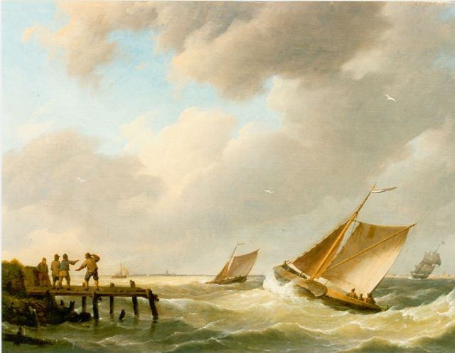 Johannes Hermanus was the first in the Koekkoek family to make painting his profession. He was born in Veere on the Zeeland island of Walcheren in 1778 and went to Middelburg around 1800 to be apprenticed to the wallpaper painter Thomas Gaal. In addition, he attended classes at the Middelburgsche Teeken-Academy in the evenings. During this time he also started painting: ships and sea, with which he followed the prevailing painting tradition in the water-rich Zeeland. His oeuvre includes cityscapes with water and historical scenes, but especially ships on troubled sea, 'choppy waters' as he called them, or anchored in calm. Scenes that he painted with the utmost precision and provided with a lively, narrative upholstery. Johannes Hermanus was famous for his faithful representation of all kinds of ship types. Contemporaries mentioned that he made ship-like models in detail for practice and study. The sea, which for the most part consisted of islands and water, was willing to lend itself to a wide variety of transports, was also an enemy, which could turn into a wild swirling body of water during unfavorable tides and storms. A shipping disaster was always lurking. Johannes Hermanus preferred to paint this dramatically, the ship with sails blown to pieces, slowly sinking into crashing waves and drowning men trying desperately to cling to wreckage. Johannes Hermanus became one of the most famous navy painters of his time and passed his talent on to four of his eight children.