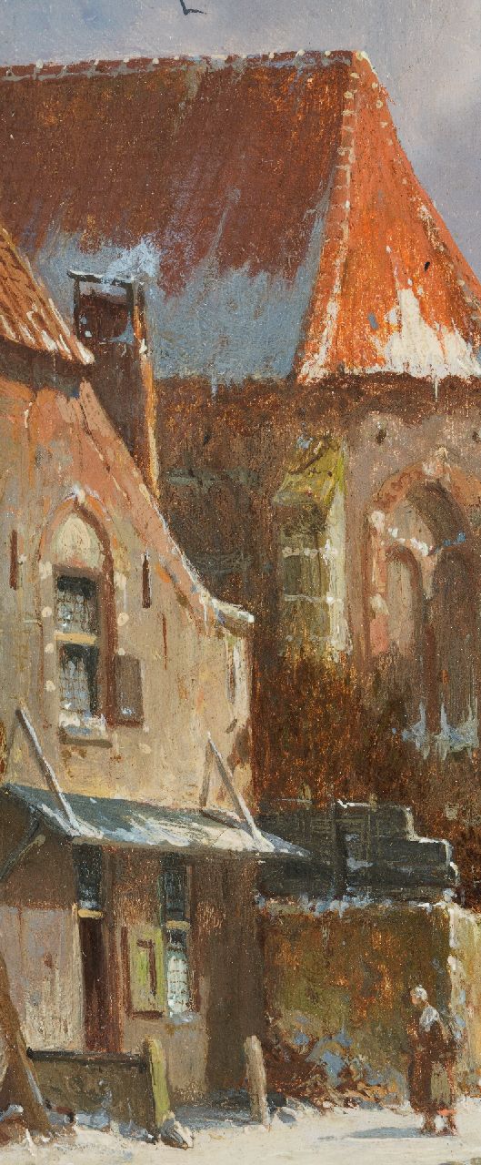 Adrianus Eversen was regarded as the most gifted pupil of the famous townscape painter Cornelis Springer. From his master he took over the compositional structure, the elaboration of details and the warm colour palette. However, he was much freer in his choice of subjects. While Springer mainly painted ‘portraits’ of existing buildings or parts of a town, Eversen usually arranged his villages and narrow streets in order to create a charming cityscape.