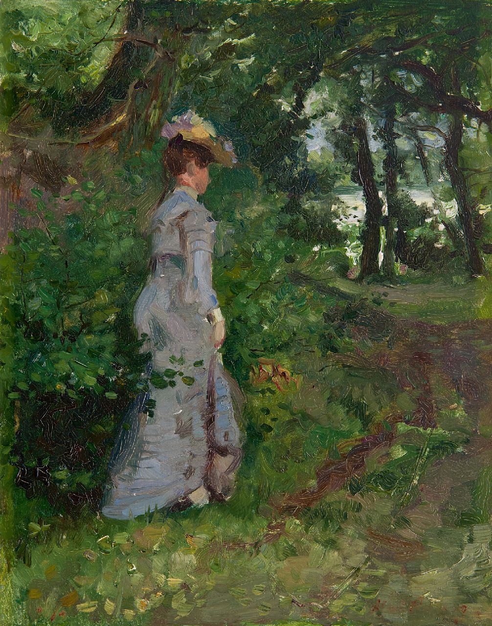 Albert Roelofs, son of the landscape painter Willem Roelofs, was an artist's child, who grew up among his father's brushes and paint. In order not to be constantly compared with his father, he abandoned the landscape early in his painting career and opted for figure and portrait paintings. A source of inspiration was his wife Tjieke, whom he married in 1900 in The Hague. He may have portrayed her here, in a performance that is somewhere between landscape and portrait. It is a smoothly-impressionistic work, as if it were a sketch. Roelofs skillfully paints the nuances of light and shadow and makes dark trunks stand out against the sun glare of a pond. His use of color is light, in contrast to the subdued tones from his father.