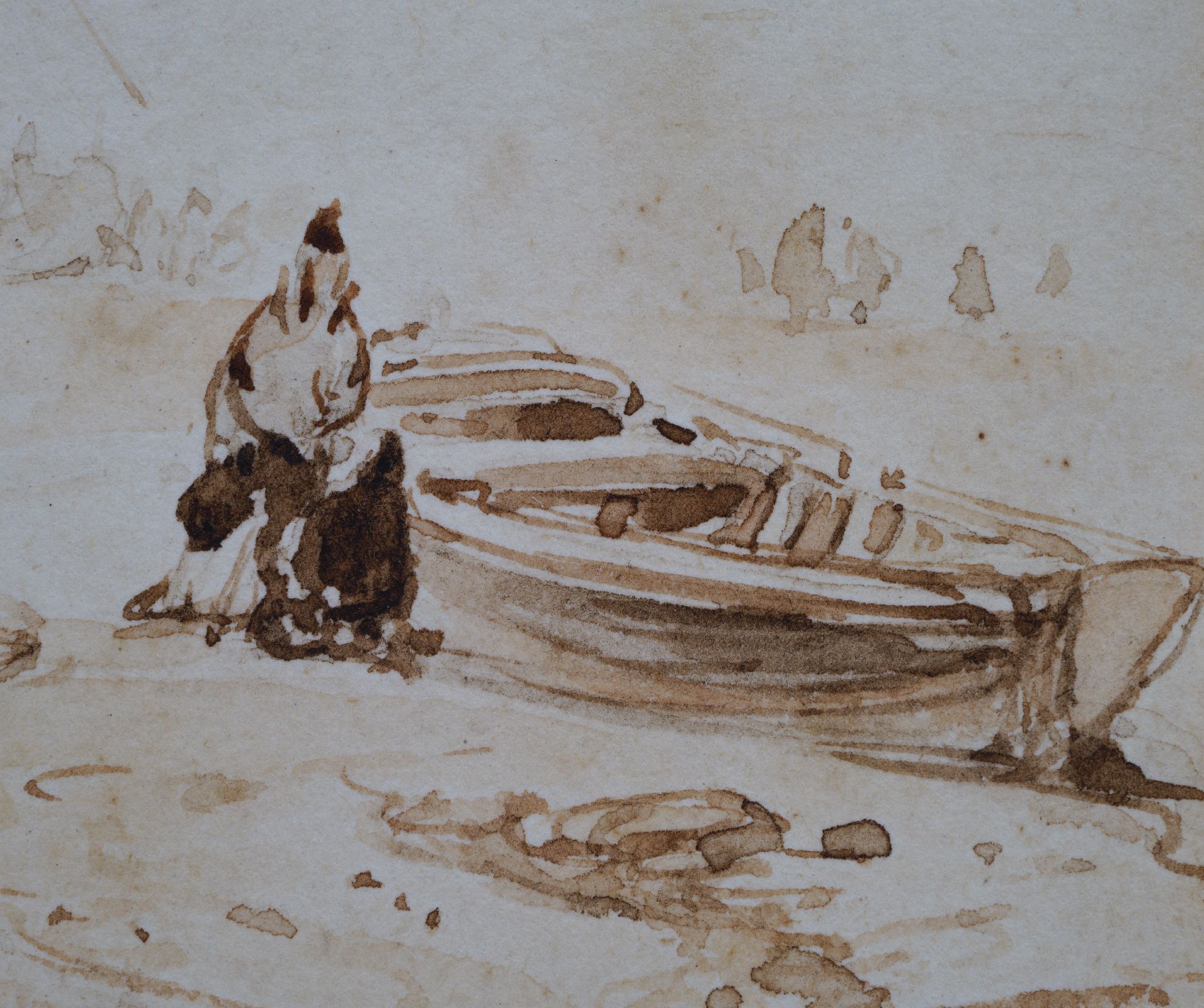 Andreas Schelfhout artwork • watercolour • drawing • previously for sale Fishermen and fishing smacks on the beach