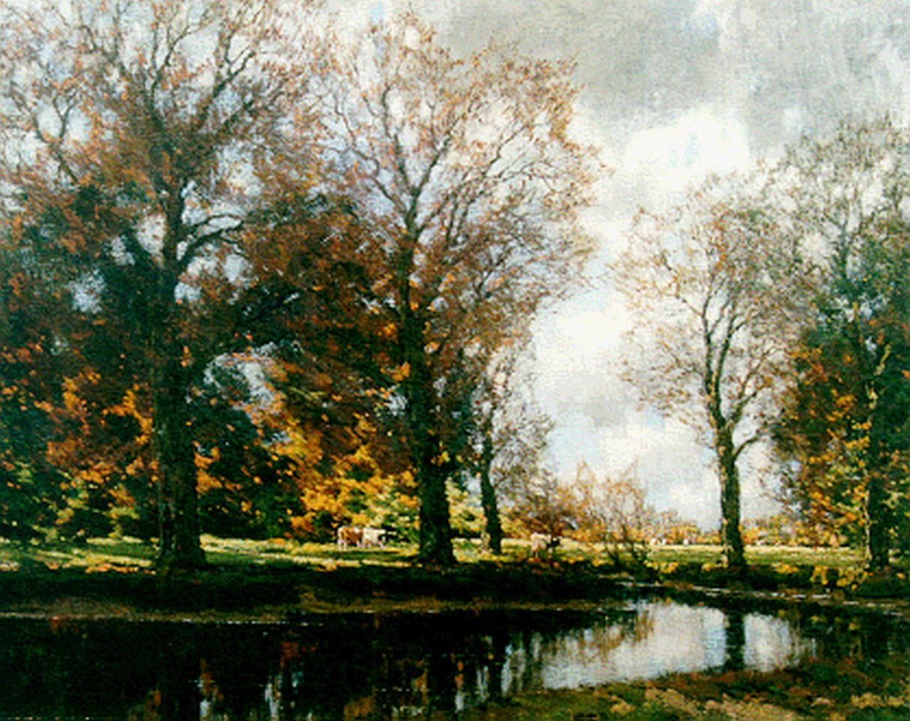 A.M. Gorter is a leading Dutch landscape painter who drew inspiration for his work from the Vechtstreek and areas in eastern Netherlands like Twente, the Achterhoek and Drenthe. He preferred painting tranquil nature in varying light conditions and in the changing colours of the seasons. In this aspect his work is similar to that of The Hague School of painting. His favourite seasons were autumn and early spring, while reflecting water and birch trees are recurring themes in his work. He was also an artistic advisor to Queen Wilhelmina and taught M.J. Bies and C.J. Dake Jr. among others.