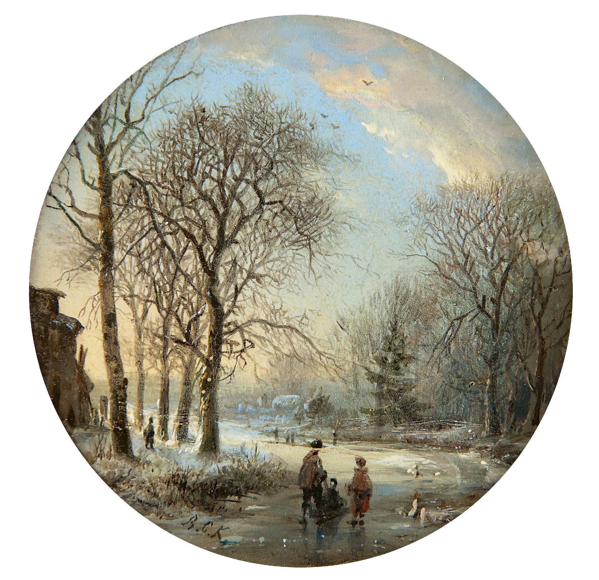 Barend Cornelis Koekkoek artwork • painting • previously for sale A winter landscape with skaters at sunset