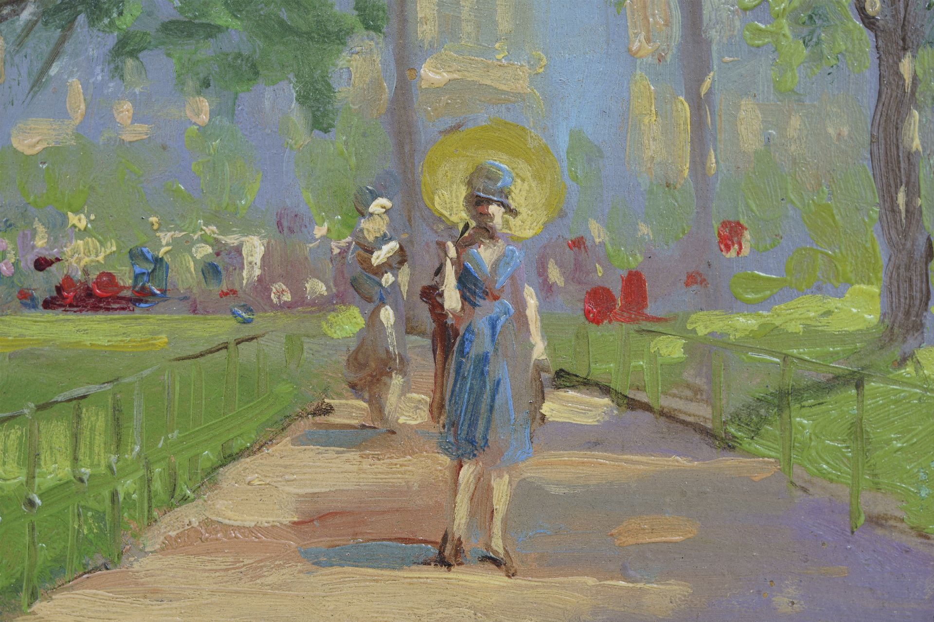 Charles Conway belonged to the group of English painters who continued to work in the Impressionist painting style into the twentieth century. For them, the beauty of the world around them was contained in the rendering of the light and of the atmosphere that surrounded things. Just like in France, the fashionable city life, summer parks, tea houses, the beach and the boulevard are their favorite subjects, painted with a quick brushstroke and in cheerful, bright colours.