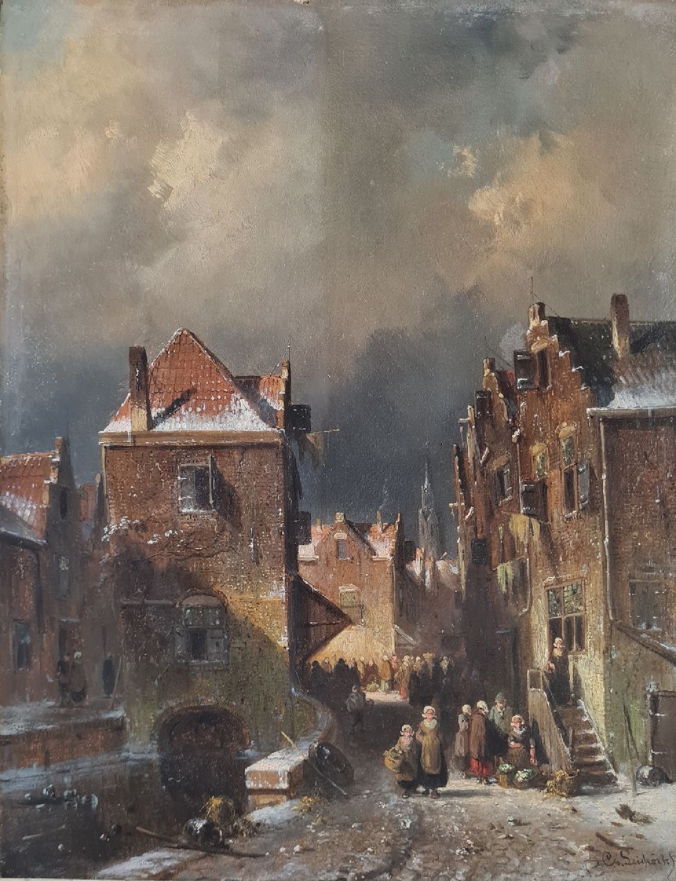 Charles Leickert was briefly a student of W.J.J. Nuijen and from 1839 by Andreas Schelfhout. This latter master in particular had a great deal of influence on his work. Leickert painted beautiful Dutch ice scenes, summer landscapes and river views in which he incorporated all kinds of motifs from his sketchbooks. After 1845 he also painted beach scenes and cityscapes. The appeal of his paintings is partly determined by the lighting and strongly narrative details. Leickert was a true craftsman, who was able to represent the right mood in a clever way and thus sensed the taste of the audience. His winter faces are really cold, his summers sunny and green.