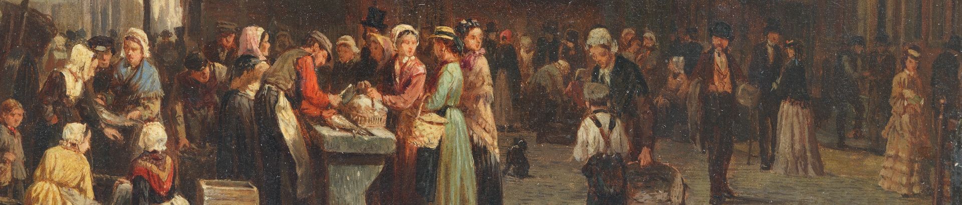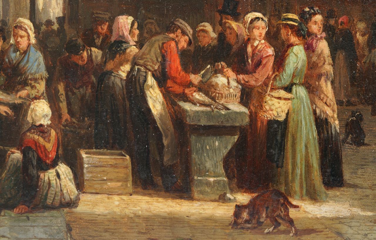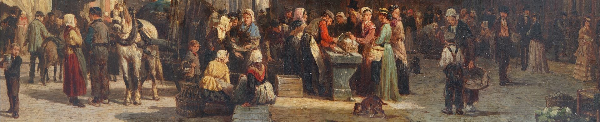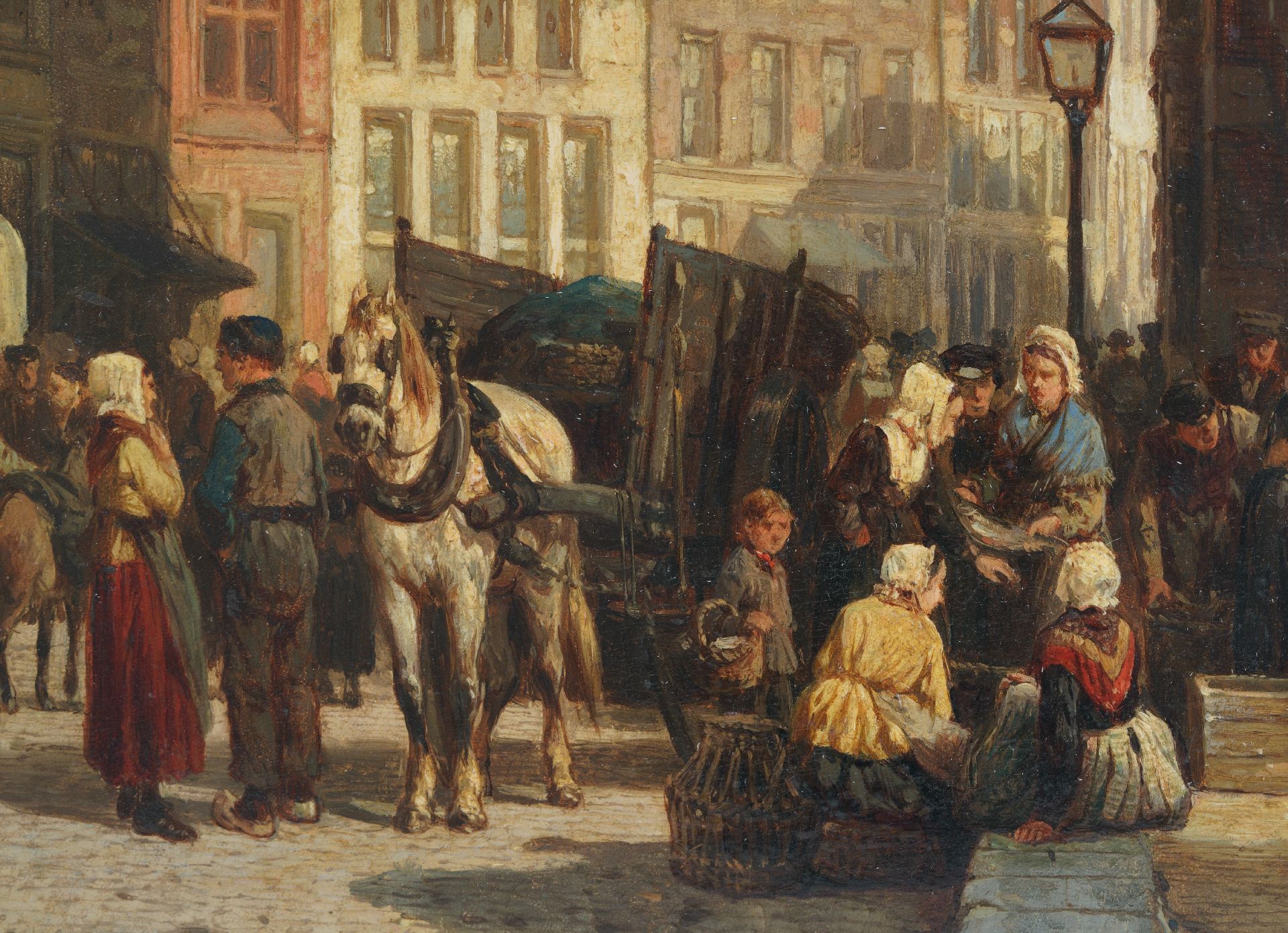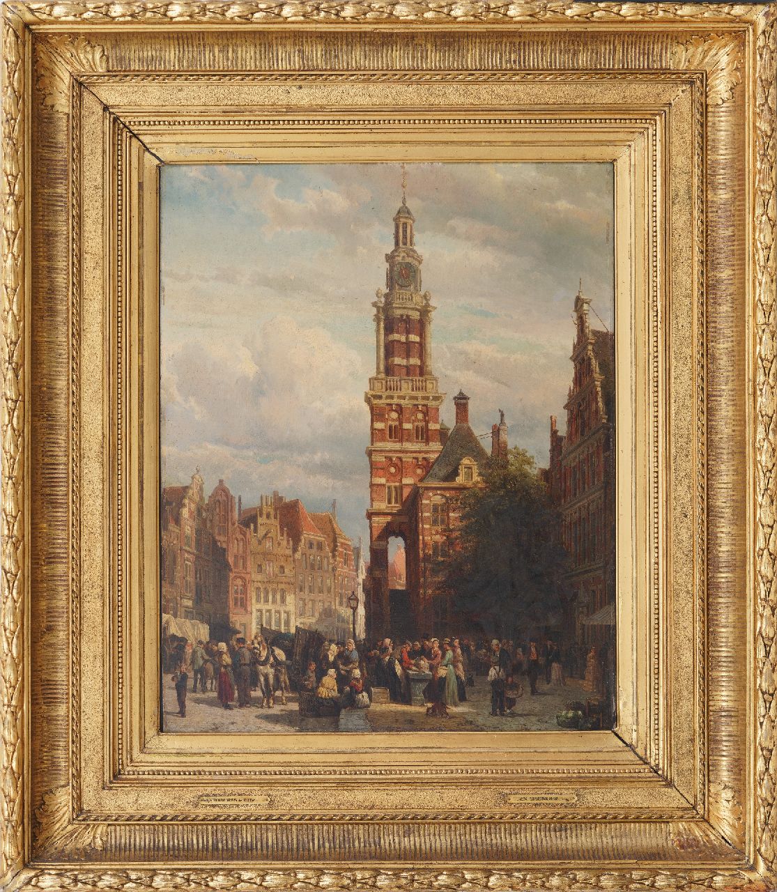 Cornelis Springer artwork • painting • for sale A Bustling Market Scene in front of the Wijnhuis Tower in Zutphen