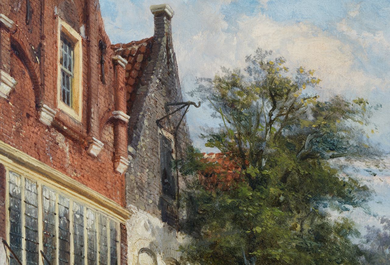 Cornelis Springer mainly painted town and village scenes in which facades and staffage are bathed in warm sunlight. Together with Barend Cornelis Koekkoek and Andreas Schelfhout, he belongs to the leading painters of Dutch Romanticism. Springer often assigns a prominent place to 17th and 18th century buildings in his paintings. Sometimes this is in the form of an imaginative piece of architecture, but in most cases these were existing buildings in which people rediscovered their beauty in around 1850. Springer first made a detailed sketch of these buildings which he later reworked into a painting.