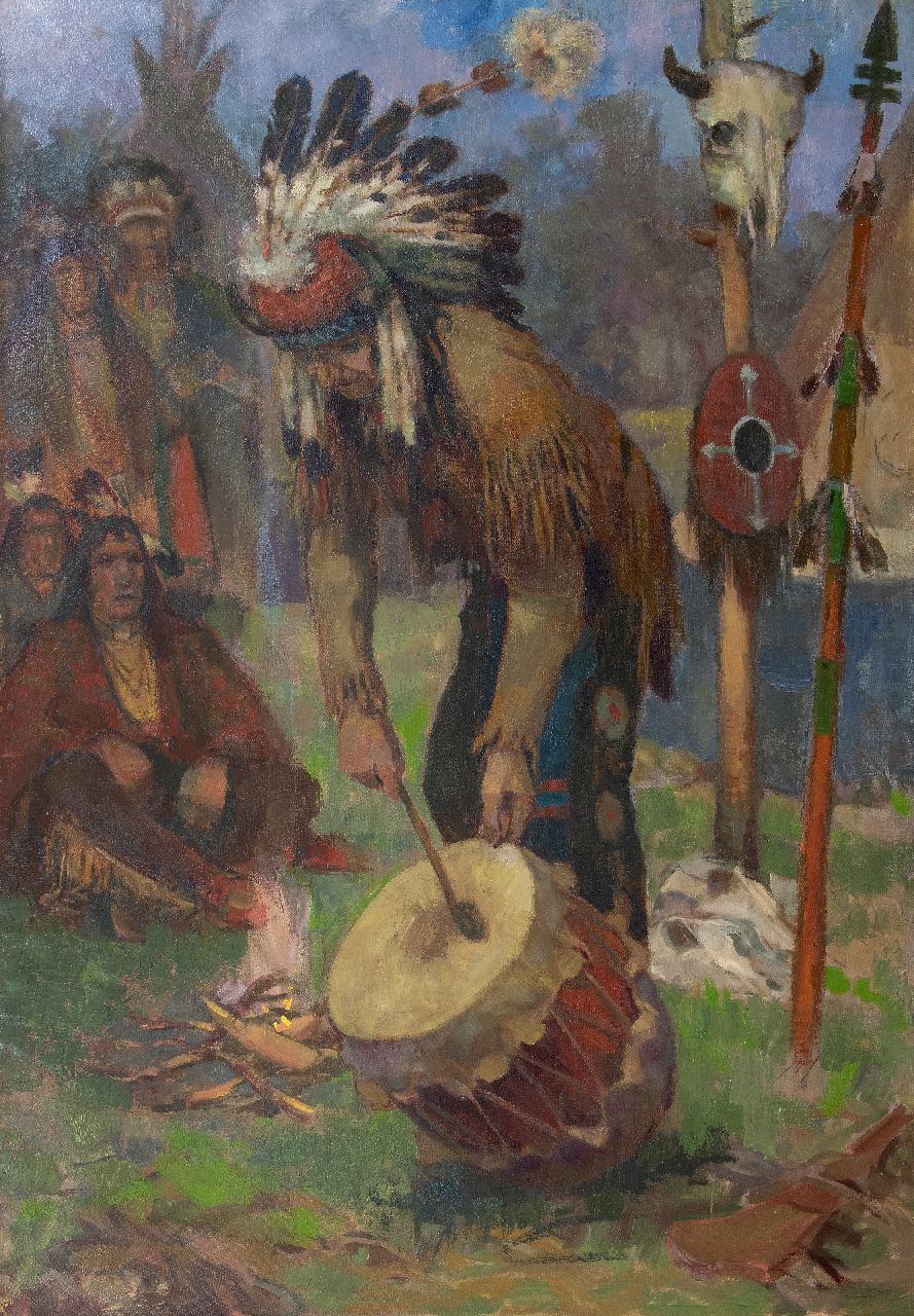Duitse School, begin 20e eeuw | Drumming medicine man of native tribe, oil on canvas, 128.0 x 89.8 cm, 1910-1920