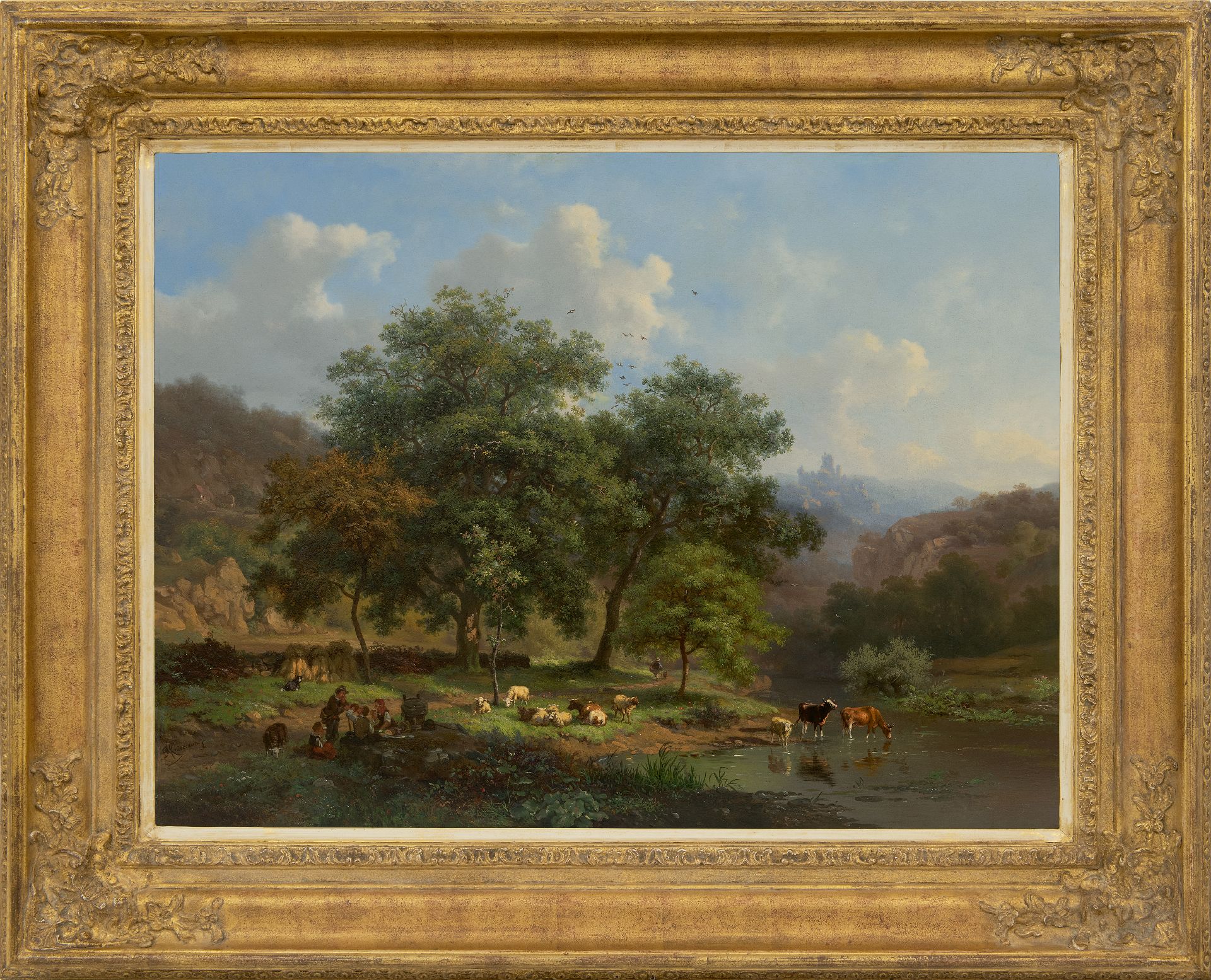 Frederik Marinus Kruseman artwork • painting • for sale Summer Landscape with resting land folk and cattle at a river