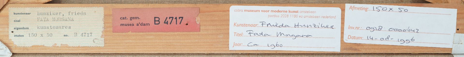 Frieda Hunziker was considered a remarkable and progressive artist in the 1950s and 1960s. Initially, she was a drawing teacher until she started painting freely herself in the 1930s. Her early work is characterized by a simplified, realistic style. In 1948 she came to complete abstraction. The year before, Hunziker was one of the founders of Vrij Beelden. This group of artists regularly exhibited in the Stedelijk Museum in Amsterdam and took place alongside the Experimentals and Cobra in the pursuit to non-figuration. Hunziker was the only woman in the group and also one of the most active members.