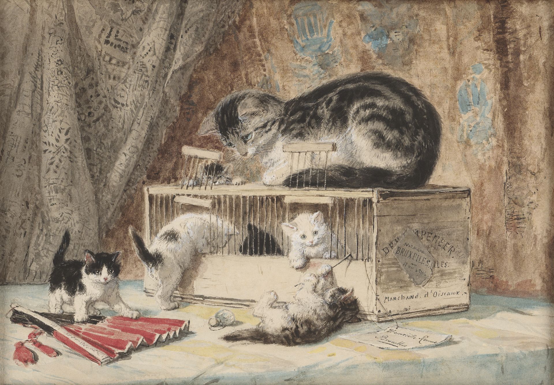 Henriette Ronner artwork • watercolour • drawing • previously for sale A cat and kittens playing with a birds cage