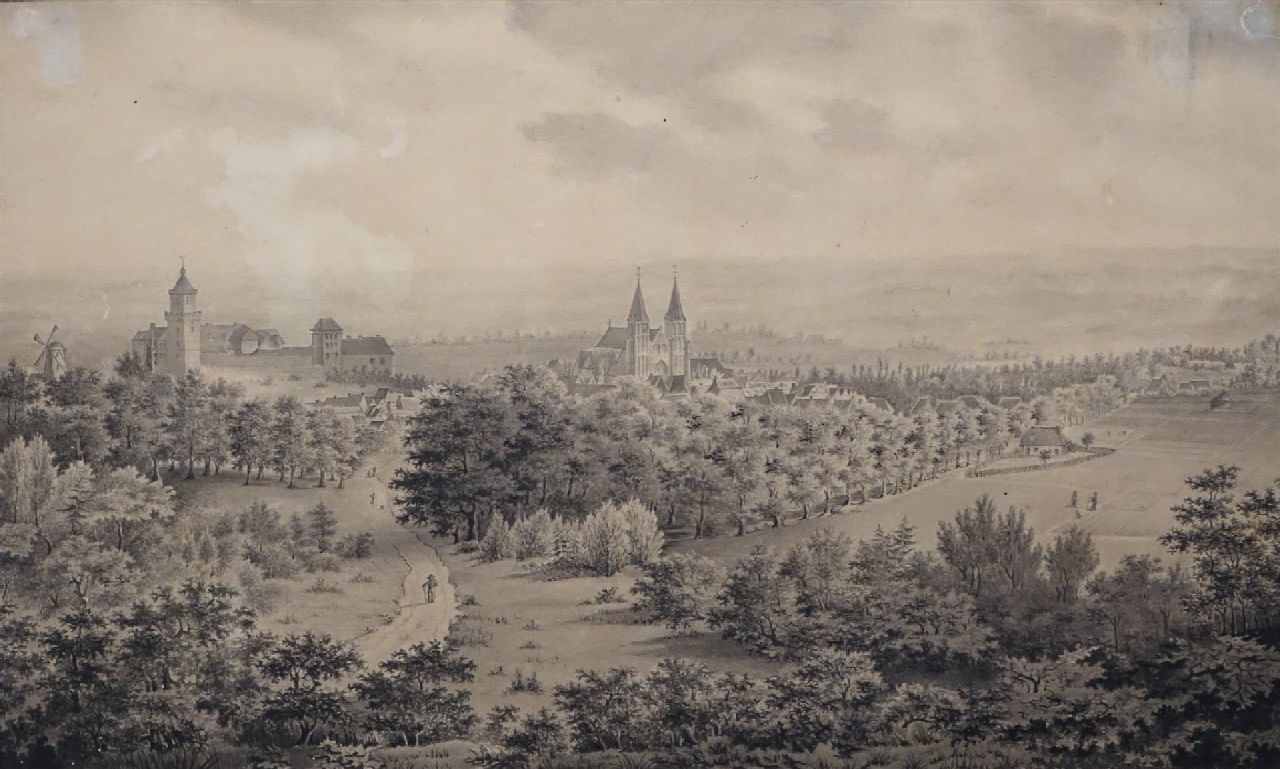 Hollandse School, 19e eeuw artwork • watercolour • drawing • for sale Panoramic view of the German city of Kleve with the Swan Castle and the Stiftskirche