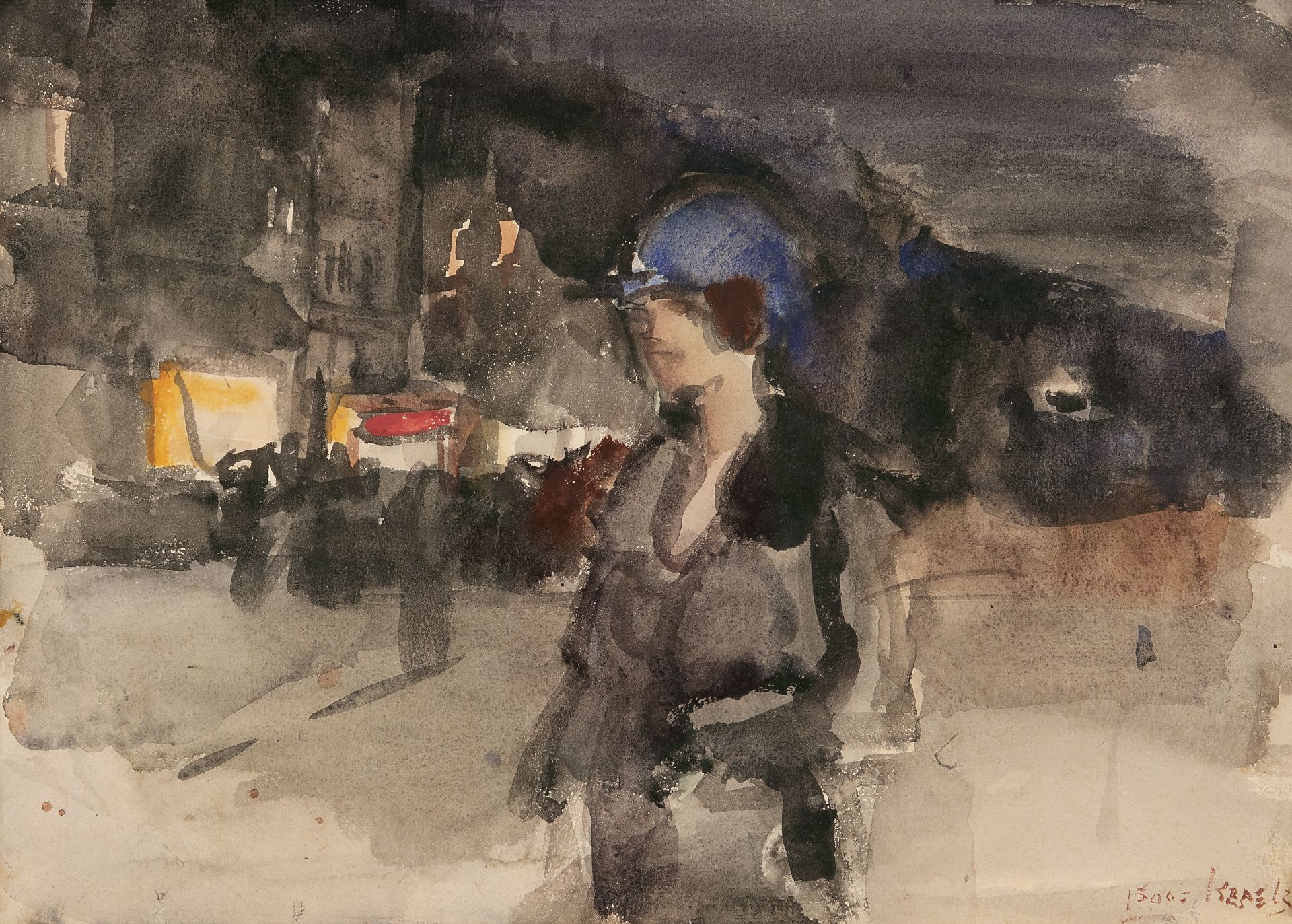 Isaac Israels artwork • watercolour • drawing • previously for sale Woman with a blue hat in Amsterdam shopping district, by night