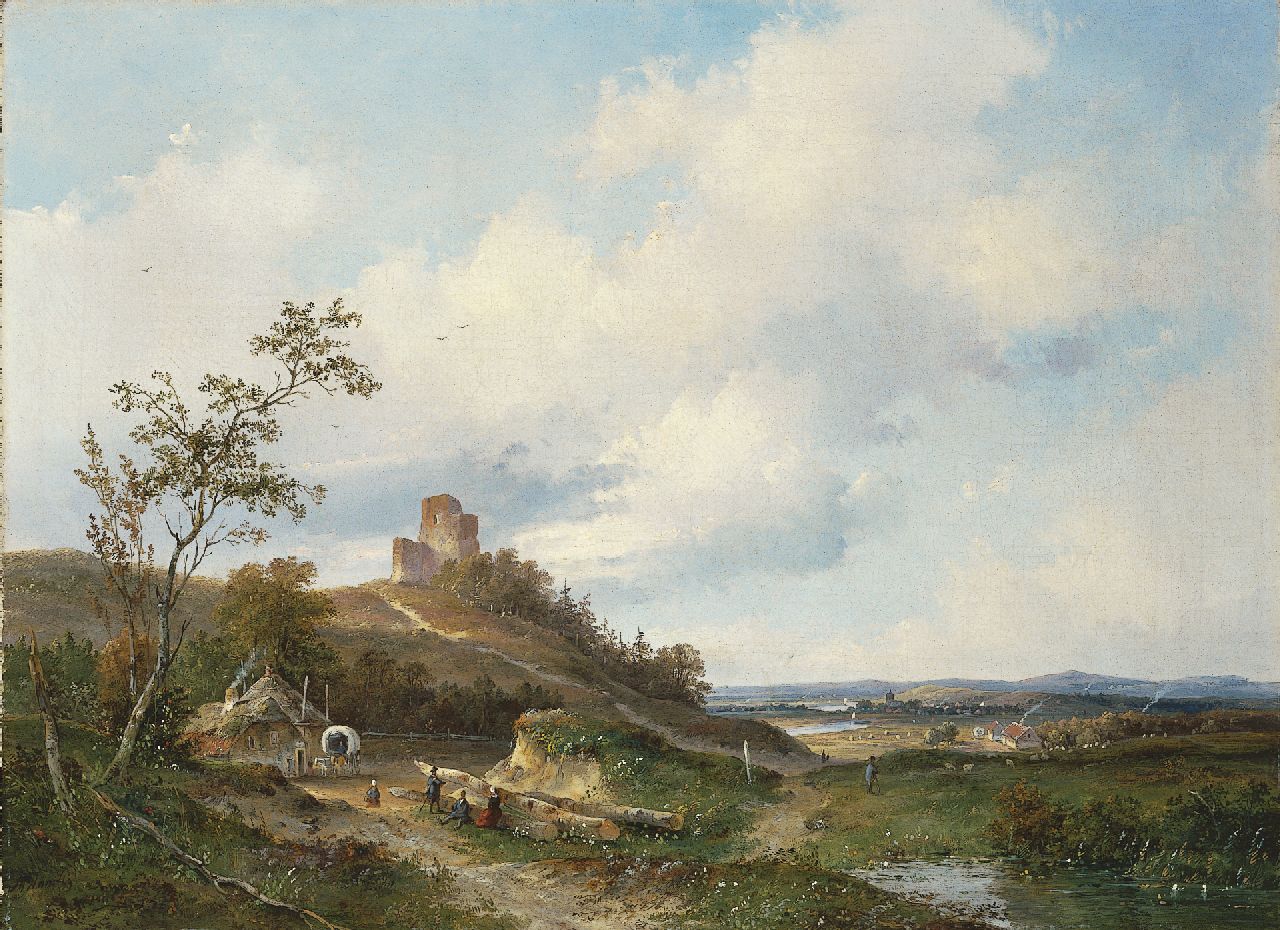 J.G. Hans artwork • painting • previously for sale A panoramic landscape with a ruin in the distance