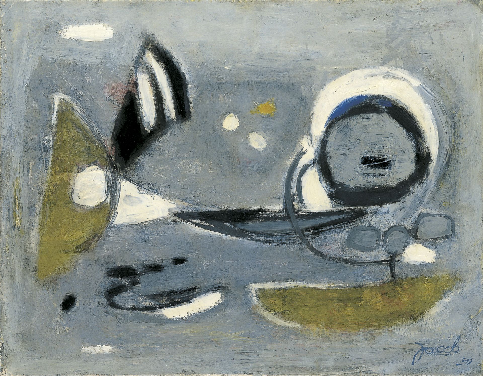 Jaap Nanninga belongs to that group of Hague painters who only made the step from figuration to abstraction after the Second World War. Among the influences on his development was the abstract work of Geer van Velde, whom he met in the South of France in 1946. Nanninga’s compositions consist of forms which he intuitively sets down onto canvas.