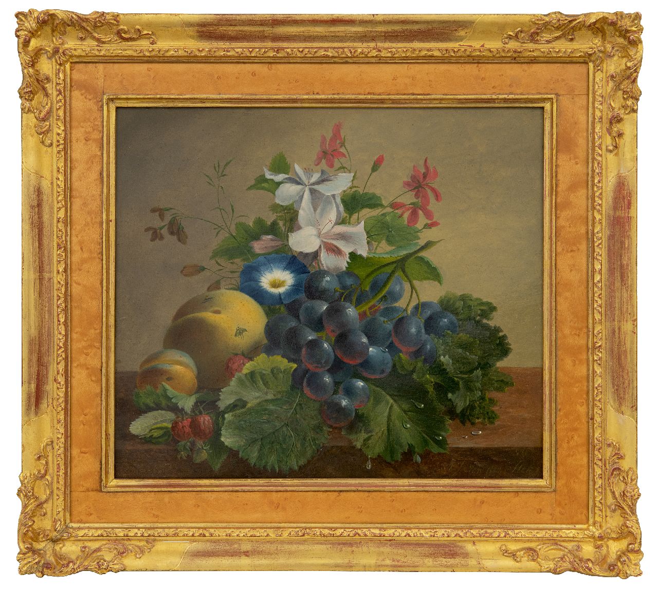 Still life with flowers and fruit on a ledge