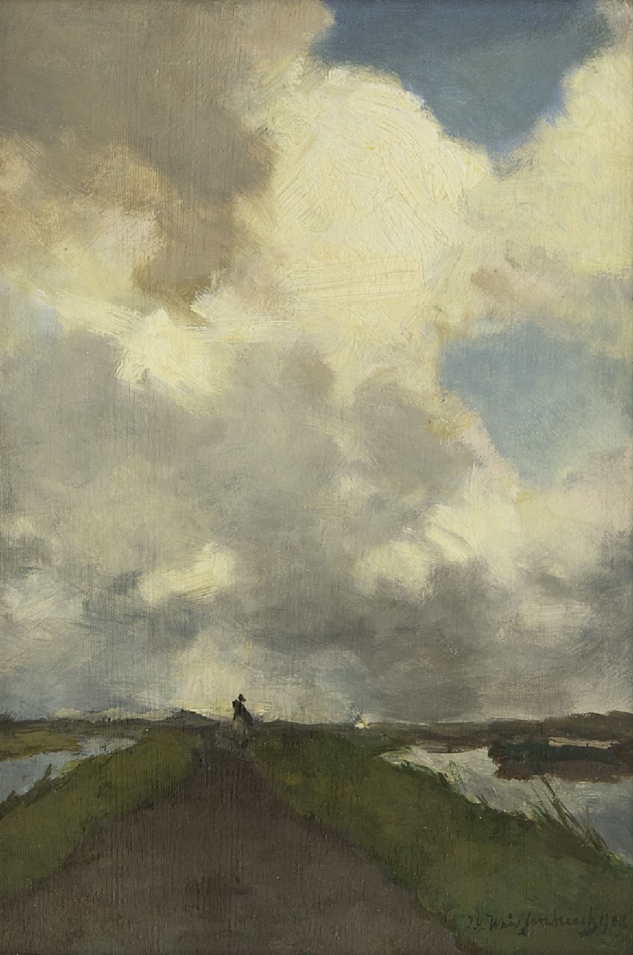 The motif of a rider on a towpath is part of the work of J.H. Weissenbruch every now and then before, in sunlight and in gray weather, in cloud shade or rain. In Ruiter op de Haagpad he depicts the subject under an impressively high cloudy sky that is reflected in the water of the towage. The dark boat that is pulled, no more than a dark stripe, is almost entirely absorbed in the bank vegetation. In this painting, all attention is focused on the phenomenal sky, and on the silhouette of the hunter that is reflected in it, seated sideways on his hunter's horse. It is a loosely brushed landscape, in which the wet, rough banks of the towpath and the mood of a rainy day are convincingly depicted. It must be one of the last paintings Weissenbruch made. Contrary to what is usually expected, the artistic quality of his work only got higher with the years, which this painting proves.
