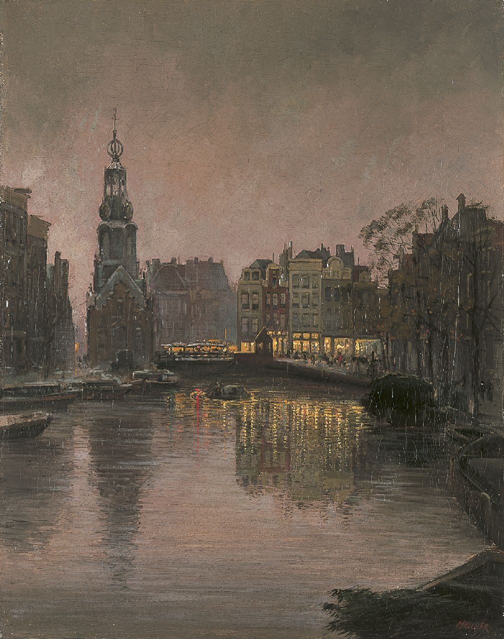 Jan Hermanus Melcher Tilmes lived and worked in Amsterdam almost all his life. Initially he specialized in painting landscapes with cattle and forest views, later he focused more and more on Amsterdam cityscapes. Melcher Tilmes not only painted the well-known spots, such as the Muntplein, the Ronde Lutherse Kerk and the Westerkerk, but also countless picturesque, lesser-known parts of the city. People often play a subordinate role in this. His early works are fine and detailed, but his touch became looser over the years. In addition, his use of colour has also developped/ His brown-green palette gradually became more colourful and lighter.