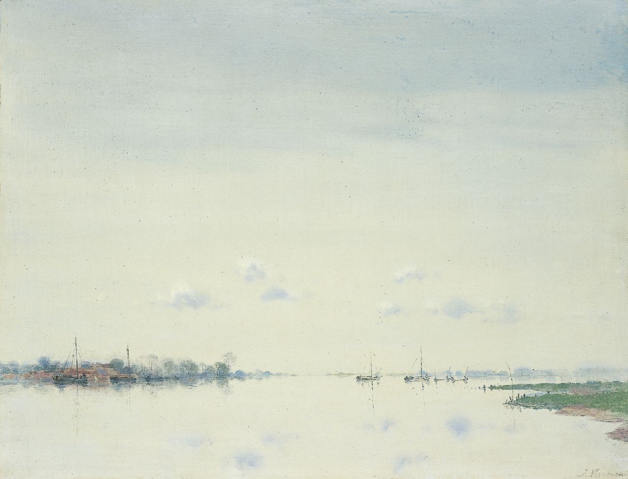 Jan Voerman was a farmer's son, and friends at a young age with the painter Willem Tholen. Together they received their first painting lessons and visited the Rijksacademie in Amsterdam. Then Voerman painted landscapes, genre paintings, flower still lifes and cityscapes. His work changed when he came to live in 1896 on the Geldersedijk in Hattem, from where he had a wonderful view of the floodplains of the IJssel, where hundreds of cows grazed. From that time on, he mainly painted IJssel views, in refined, pale colors under high cloudy skies. Voerman painted a lot of watercolors and tried to transfer the transparency of this technique to oil paint.